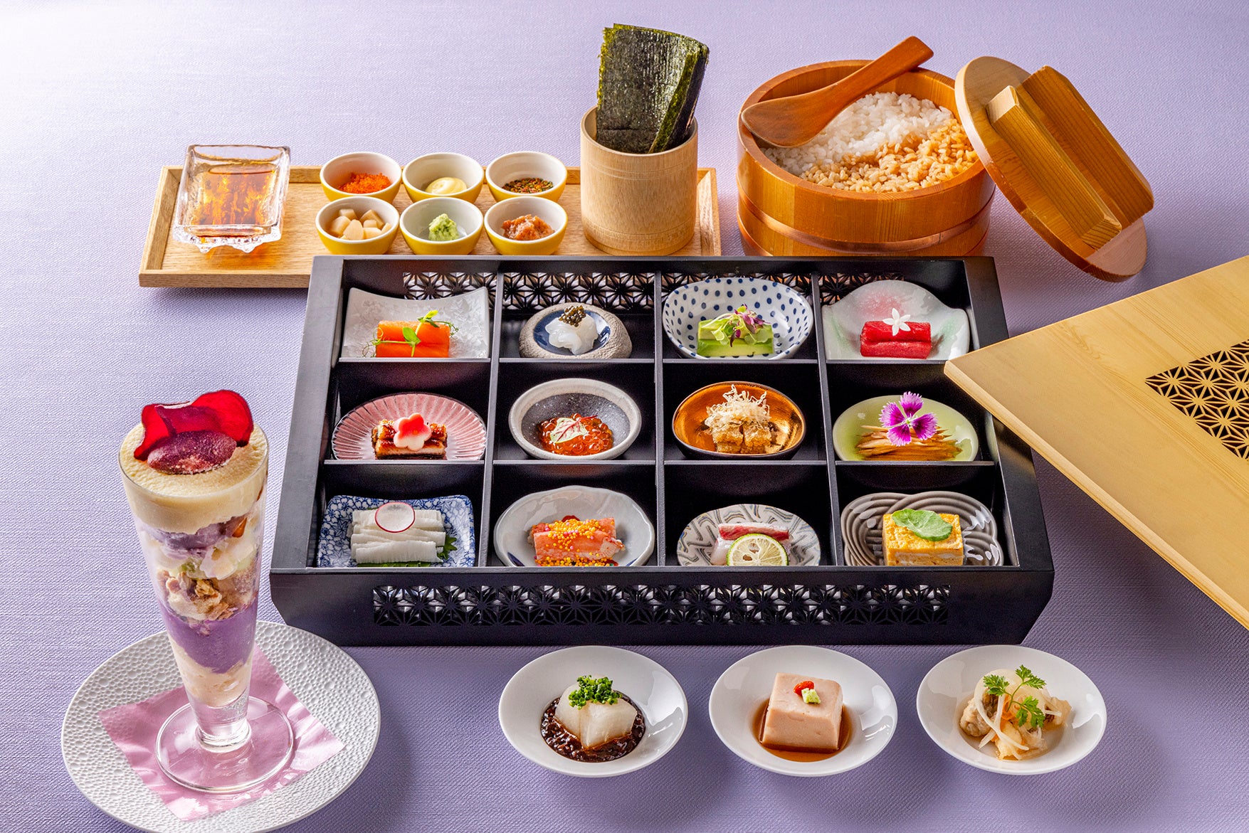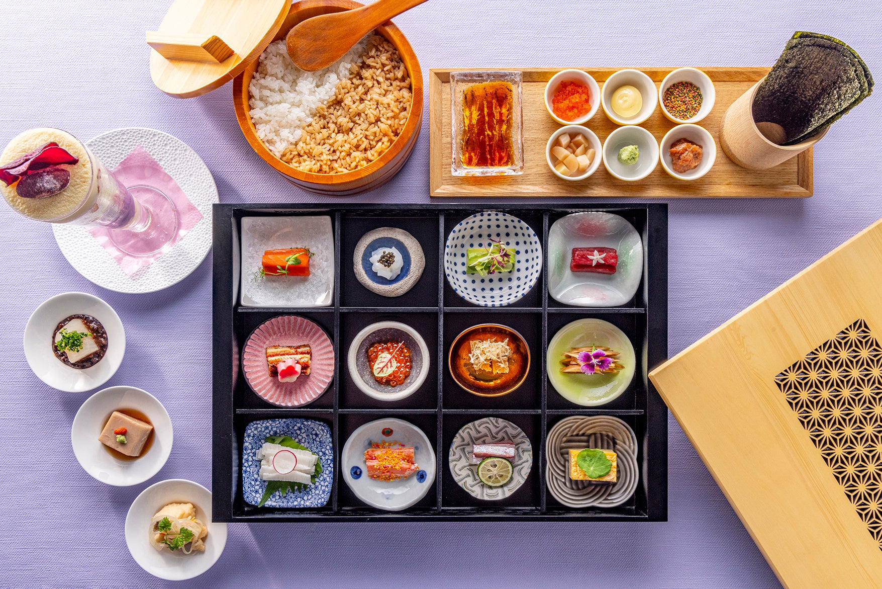 まるでテーブル上で上質なおままごとを楽しんでいるかのような「十二颯」の手巻きすしランチは、良い物を少しずつ楽しみたい大人の女性に贈る新提案です。上品な木箱には鮪や蟹、いくらや鰻などのすしネタに加え、香ばしく炊いた山牛蒡やアボカド、長芋などの野菜も彩りよく配され、華やいだランチタイムを予感させます。海苔にすし飯を乗せた後は、お好みのすしネタに梅肉やトビコなどのトッピングを加え、ご自分だけのオリジナル手巻きすしをお楽しみいただけます。