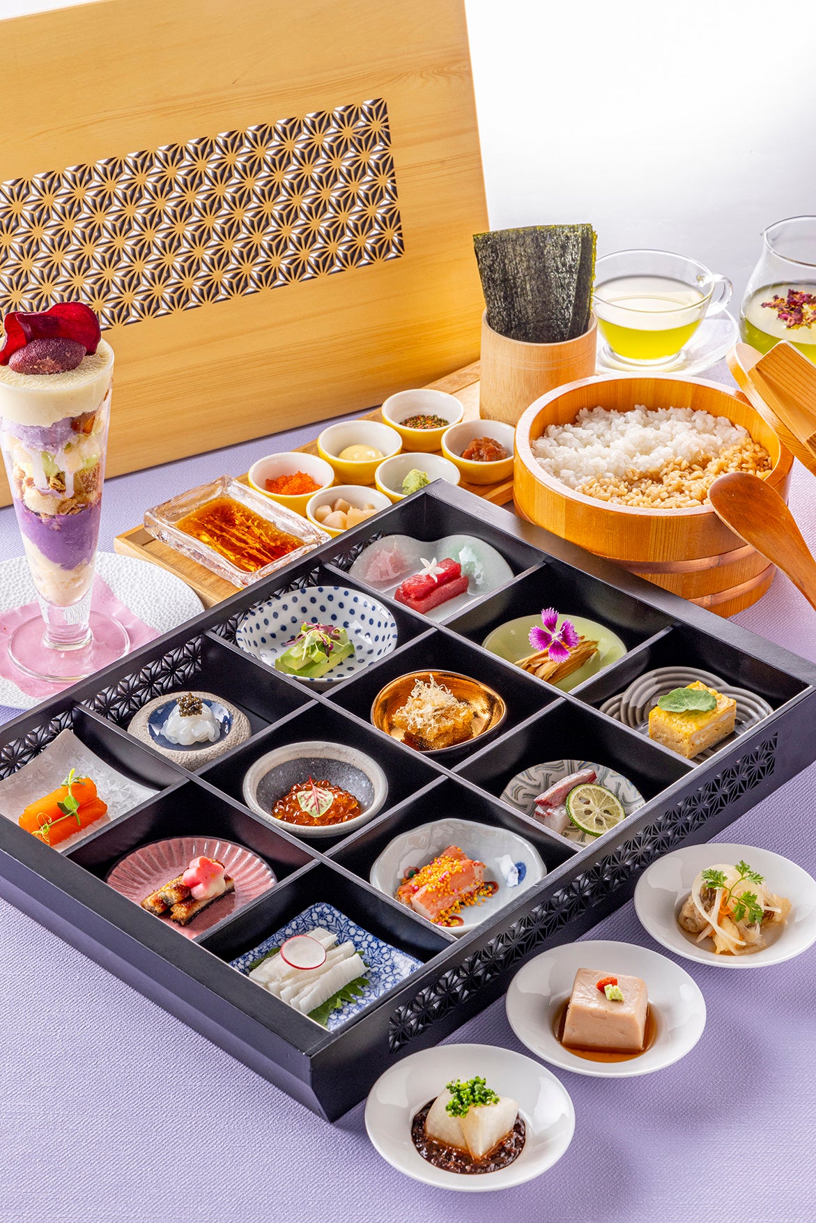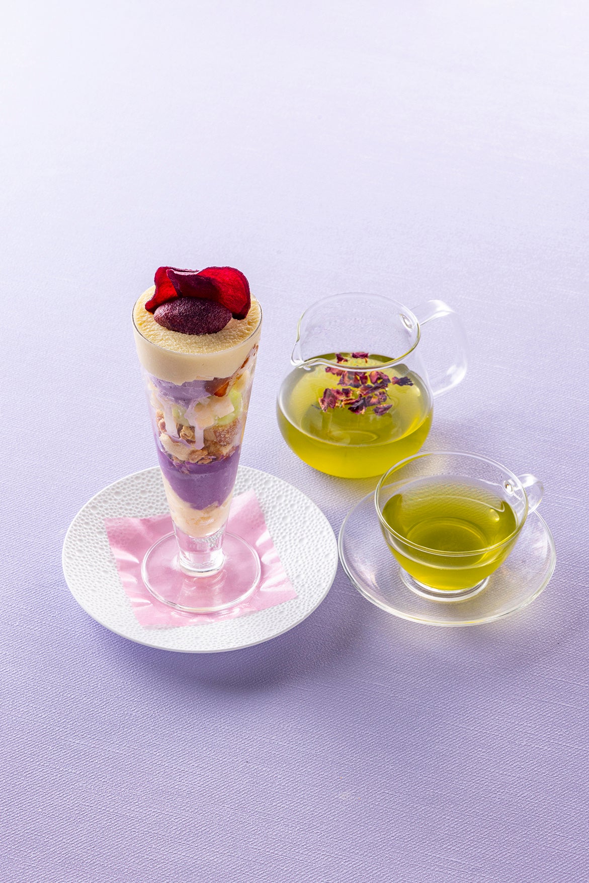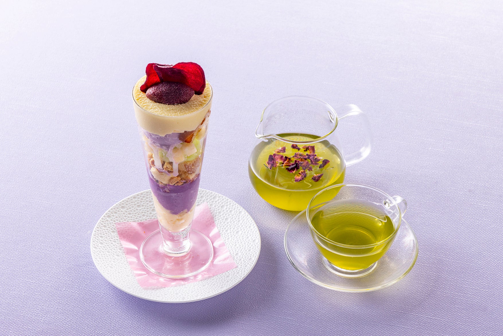 食後にはスイートポテト風さつま芋クリームと大学芋、りんごのプリンやシャーベットなどが爽やかに調和する「さつま芋と林檎のパフェ」を上質な国産煎茶をベースに、バラ、ラベンダー、金木犀やジャスミンの花を贅沢にブレンドしたヒルトン東京特製花煎茶と共にゆったりとご賞味ください。お一人様でパーティー気分を楽しんだり、年始のご友人との優雅なご会食など、様々なシーンでご利用いただけます。