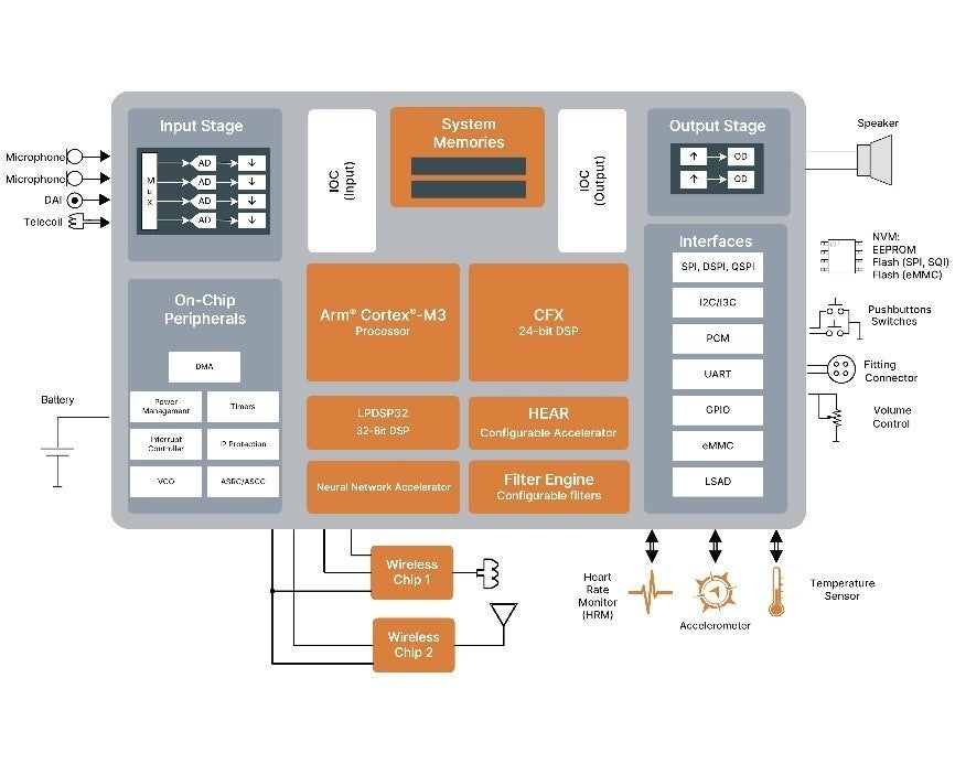 インテリジェントなパワーおよびセンシング技術のリーディング・サプライヤであるオンセミ(onsemi、本社 米国アリゾナ州フェニックス、Nasdaq: ON)は、同社のDSPベースのオーディオプロセッサ・ソリューションであるEZAIRO®ファミリが、最新のオーディオ製品の品質向上に貢献していると発表しました。同ファミリの最新デバイスEzairo 8300は、補聴器などヒアラブル製品に特化して設計・開発されており、このアプリケーション分野での性能にそれぞれ最適化された6つのプロセッシングコアを搭載しています。これには、3つのDSPコア、マイクロコントローラ、2つのハードウェアアクセラレータが含まれ、そのうち1つは、AIおよび機械学習機能をエネルギー効率の高い方法で、追加のプロセッサ機能を必要とせずに実行するように設計された、ニューラル・ネットワーク・アクセラレータです。