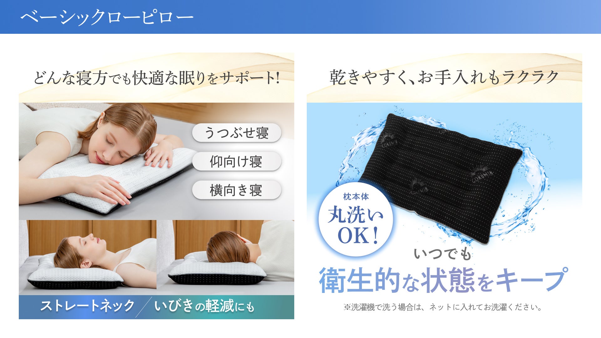「色々な枕を試してもしっくりこない」そんなお悩みを抱える方に最適な枕が新登場いたします。わずか2cm*の薄型設計が首や肩への負担を軽減し、どんな寝姿勢でも快適な眠りを提供します。ふんわりとした綿に耐久性のあるチップウレタンを加え、通気性を向上させながら長期的にご使用いただける設計です。付属のストレッチ素材の替えカバーは肌触りが良く、洗濯のサイクルもサポートいたします。
