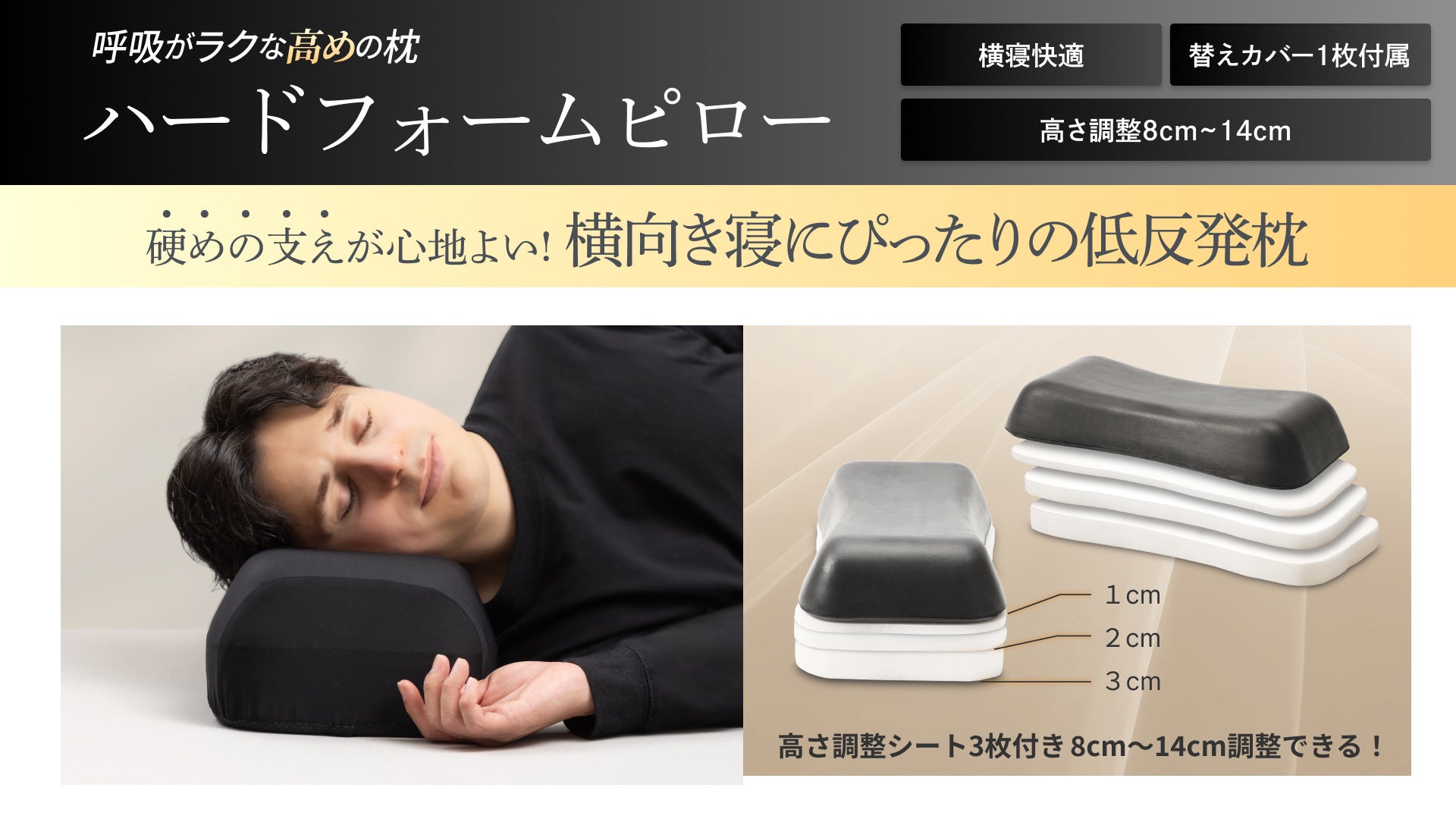 硬めの低反発ウレタン素材を採用し、首や肩にフィットして呼吸を快適にする高め設計の枕が新登場いたします。高さ調整シートを使用することで、8cmから14cmまで自在に調整でき、理想的な高さでの眠りをサポートします。また、胸筋ストレッチや体のメンテナンスにも活用可能な汎用的な設計となっております。さらに、スペアカバーが付属しており、清潔な状態を保ちながら長期間お使いいただけます。