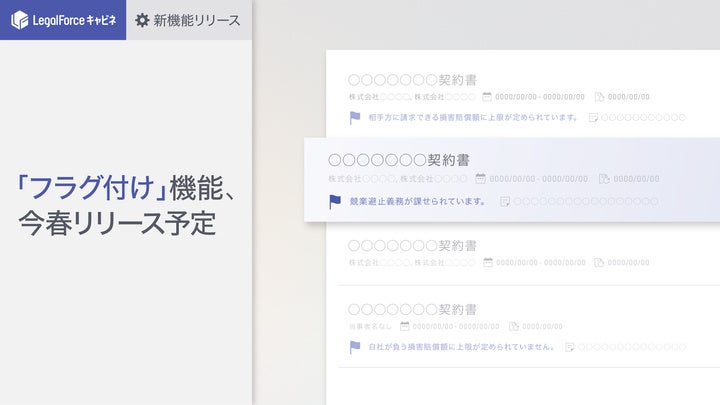 AI契約管理システム「LegalForceキャビネ」 を提供する株式会社LegalForce(本社:東京都江東区 代表取締役CEO:角田望、以下LegalForce)は、契約リスクがある契約書にフラグを付け、モニタリングを可能にする「フラグ付け機能」を新たに搭載します。本機能により、リスクがある契約書の把握が容易になり、契約トラブルを未然に防止することが可能になります。なお、本機能の搭載は2022年春頃を予定しております。