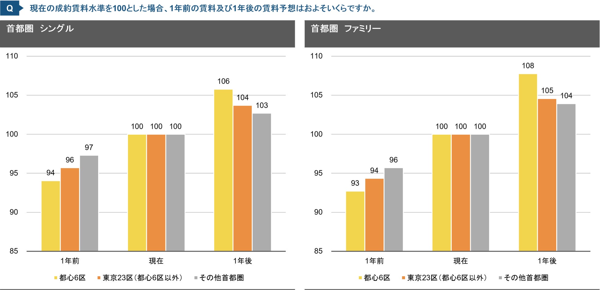 首都圏の成約賃料については、シングル、ファミリーともにいずれのエリアでも賃料上昇が続くことが見込まれている。エリア別では都心に近いほど上昇率が大きく、部屋タイプ別ではファミリータイプの上昇率が大きいと見られている。(地方圏では、大阪市および福岡市で賃料上昇、名古屋市で賃料横ばいが見込まれている)