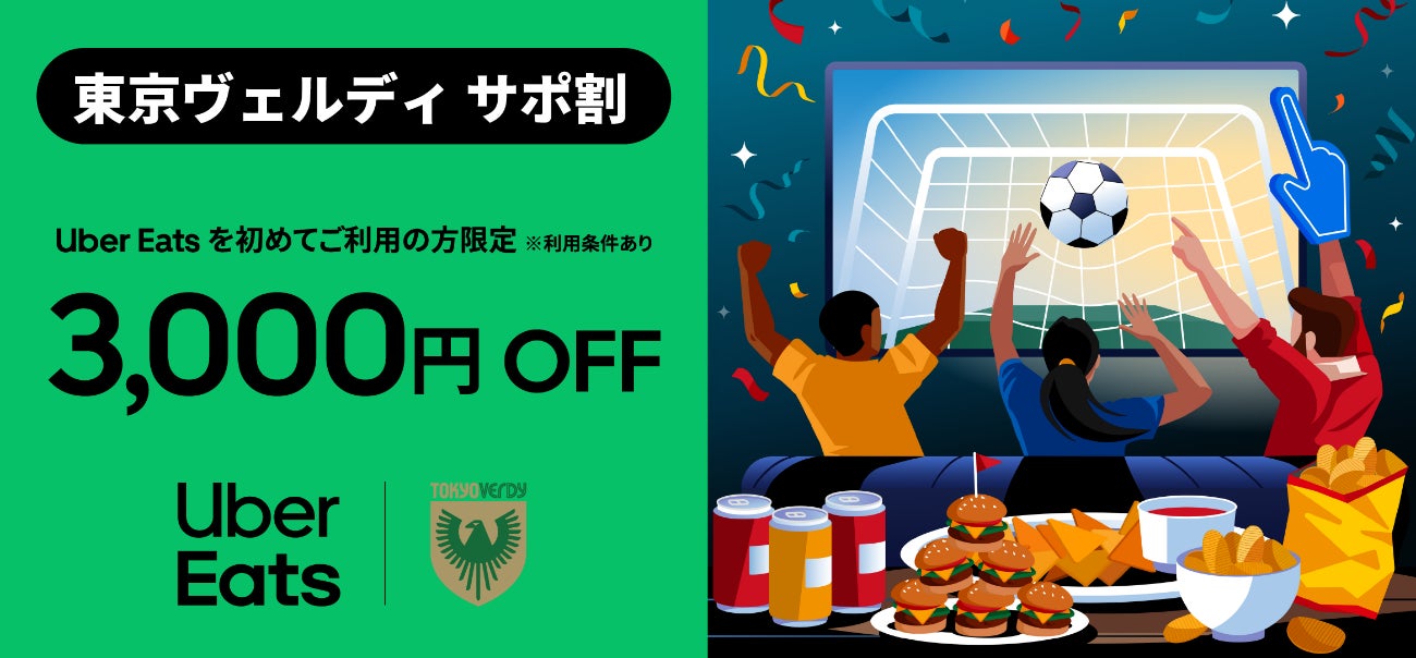 パートナー契約締結を記念して東京ヴェルディのファン・サポーターの方を対象に、Uber Eats を初めてご注文の方限定の3,000 円OFFキャンペーンを実施します!