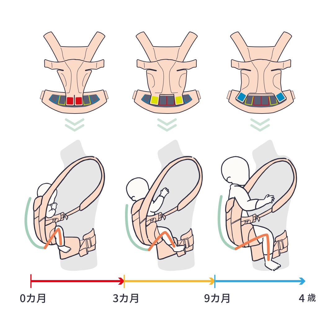 ウエストベルトの内側を調整するだけで、シートの幅とおしりが入る部分の深さが変わり、どの月齢でも自然なC字の背中と、M字の脚をキープできる構造※1。