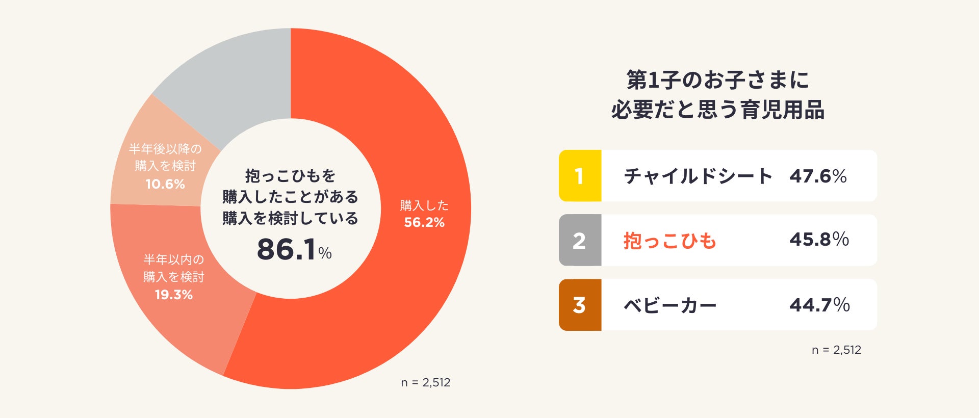 抱っこひもを購入したことがある方、購入を検討している方は86.1%。また、「第1子のために必要だと思う育児用品」のアンケートにおいて、1~3位に「抱っこひも」を選択した方は45.8%。「チャイルドシート(47.6%)」に次いで、必須のアイテムとして考えられていることが分かりました。