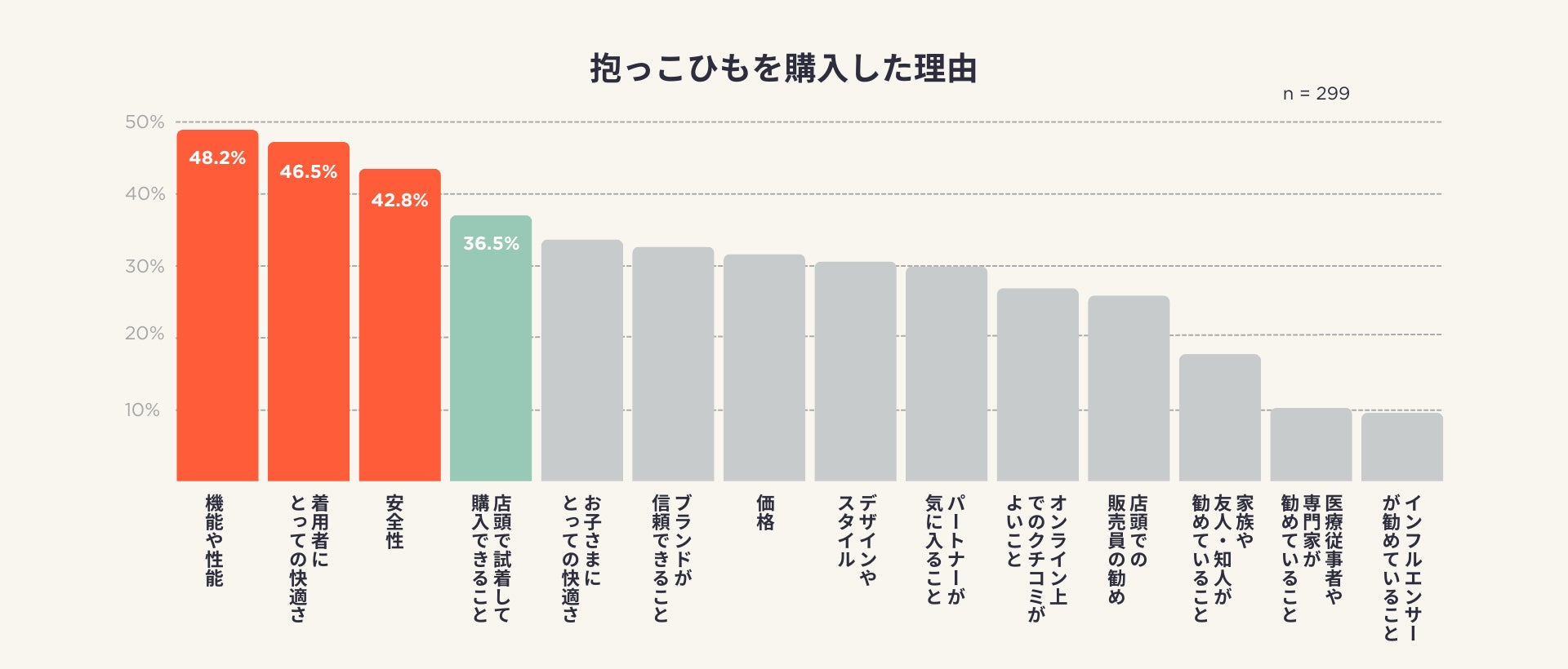 抱っこひも購入者は、「機能や性能(48.2%)」「着用者にとっての快適さ(46.5%)」「安全性(42.8%)」を重視していることが分かりました。これらに次いで「店頭で試着して購入できること(36.5%)」も上位にランクインしており、試着体験を通じて商品理解を深め、安心して使用できるものを吟味していることが伺えます。