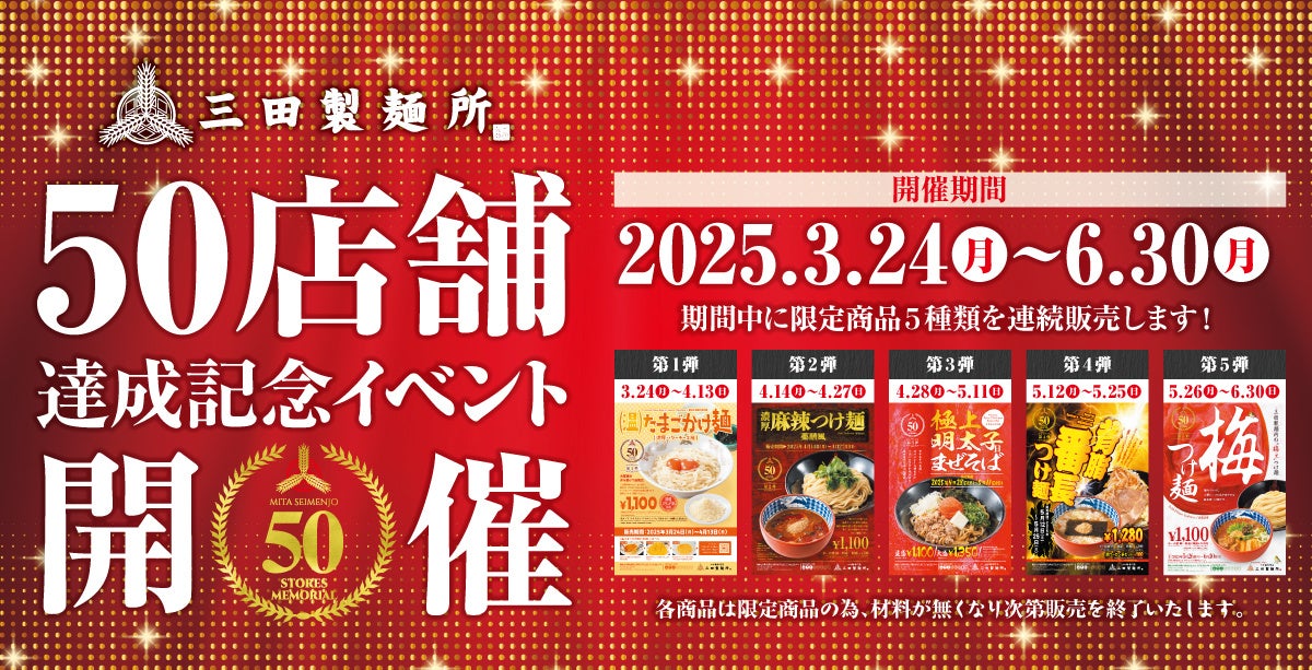 株式会社エムピーキッチンホールディングス傘下の株式会社エムピーキッチンが運営する(本社:東京都渋谷区、代表取締役:村上竹彦)『つけ麺専門店 三田製麺所』は、2025年3月に50店舗目の出店を果たしました。これを記念して、大ヒット商品『たまごかけ麺』系の新作となる『(温)たまごかけ麺 ~濃厚バター風~』、『濃厚麻辣つけ麺』などの新商品に、過去に人気があった商品の“リバイバル商品“3点を加えた限定5商品を、約3か月にわたり入れ替えで販売します。販売期間は2025年3月24日(月)~6月30日(月)を予定しております。
