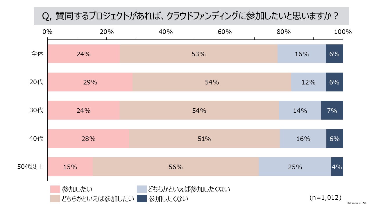 お客さまの声を最先端の分析でファン増加につなげる企業、株式会社ファンくる(本社:東京都千代田区、代表取締役社長:山口敬人)は、「ファンくる」会員を対象に、定期的に消費者の意識調査を実施しています。今回はクラウドファンディングへの参加意欲について、クラウドファンディングへの参加意欲や、参加を決める際に重視することなど「ファンくる」会員1,012名(男性230名、女性782名)に調査を実施しました。