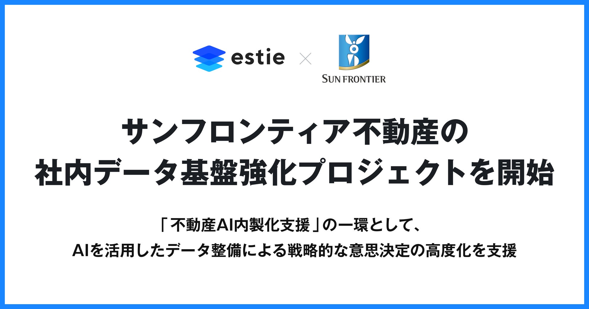 日本最大級の商業用不動産データと業界特化型AIで意思決定を支える株式会社estie(本社:東京都港区、代表取締役:平井 瑛、以下「estie」)は、サンフロンティア不動産株式会社(本社:東京都千代田区、代表取締役社長:齋藤 清一、以下「サンフロンティア不動産」)と共同で、同社の「社内データ基盤強化プロジェクト」を開始しました。