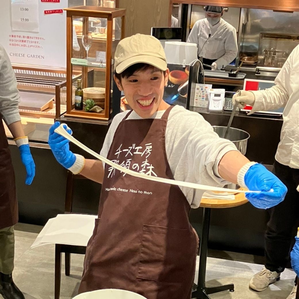 那須に工房を構えるチーズ職人の指導のもと、さけるチーズ作りを体験いただけます。カードと呼ばれる“チーズのもと”から、ご自分の手で実際に作っていただけます。完成後はその場で出来立てのさけるチーズをお楽しみください。