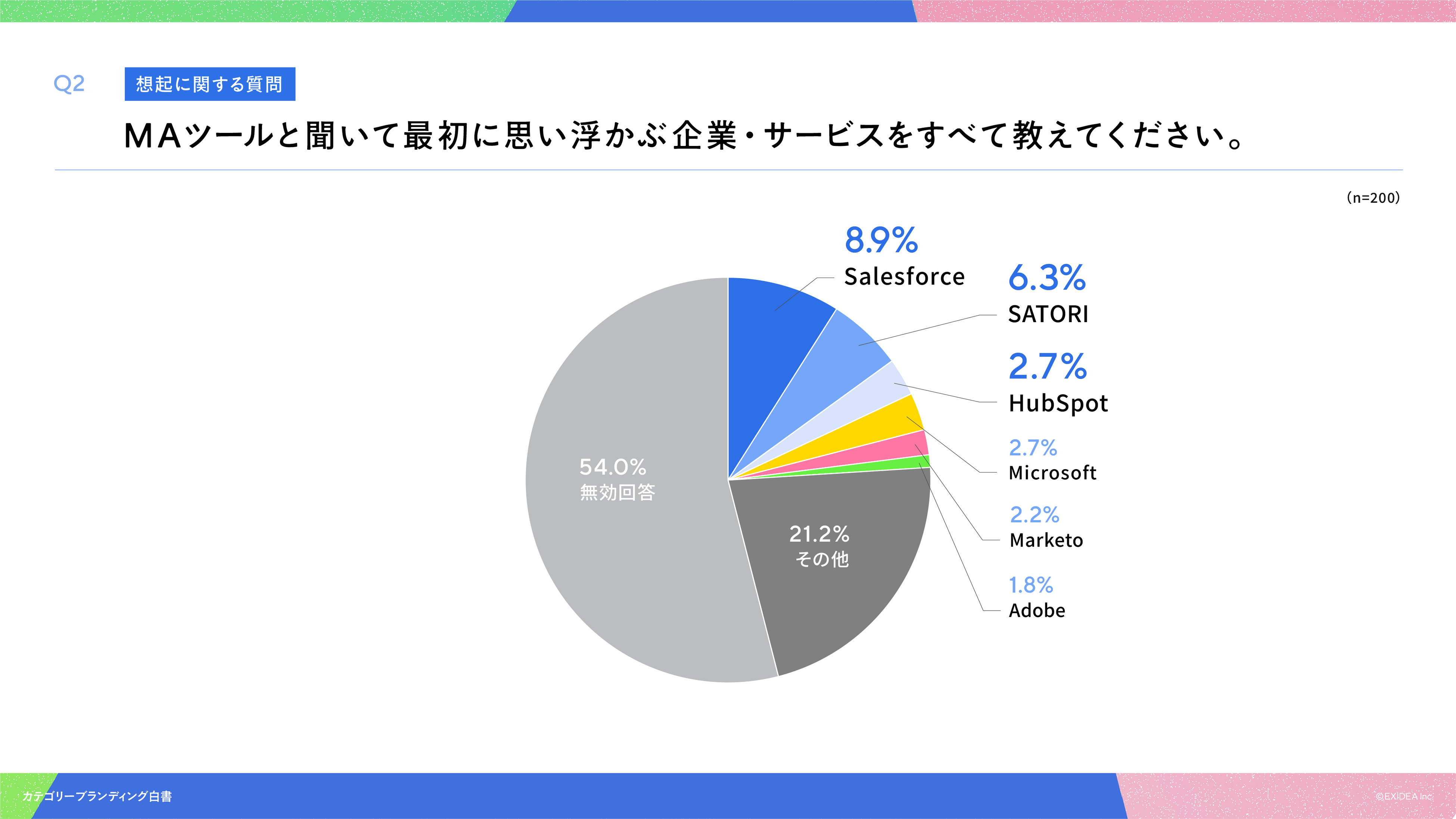 「Q2. MAツールと聞いて最初に思い浮かぶ企業・サービスをすべて教えてください。(自由回答)」(n=200)と質問したところ、Salesforceが8.9%、SATORIが6.3%、という回答となりました。