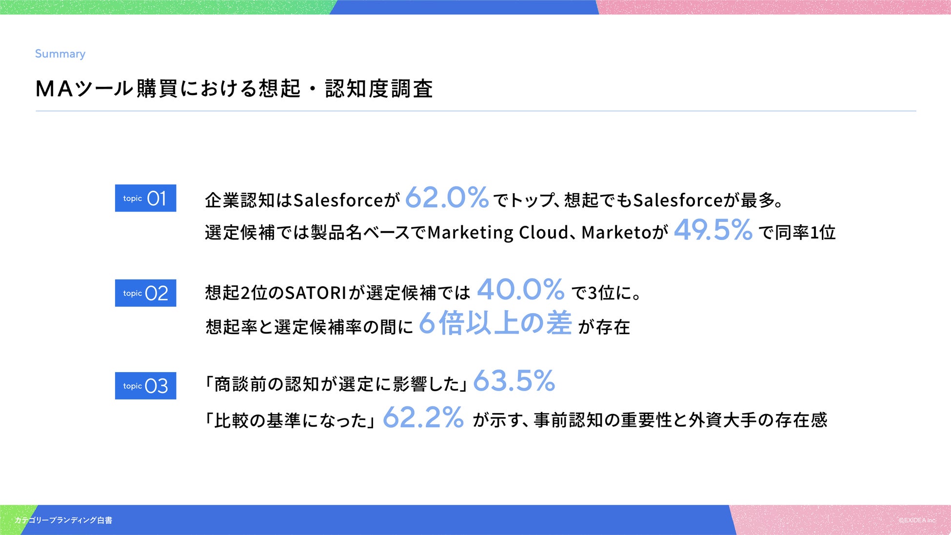 01|企業認知はSalesforce(62.0%)がトップ、想起でもSalesforceが最多。しかし選定候補では製品名ベースでMarketing Cloud 、Marketo(各49.5%)が同率1位。