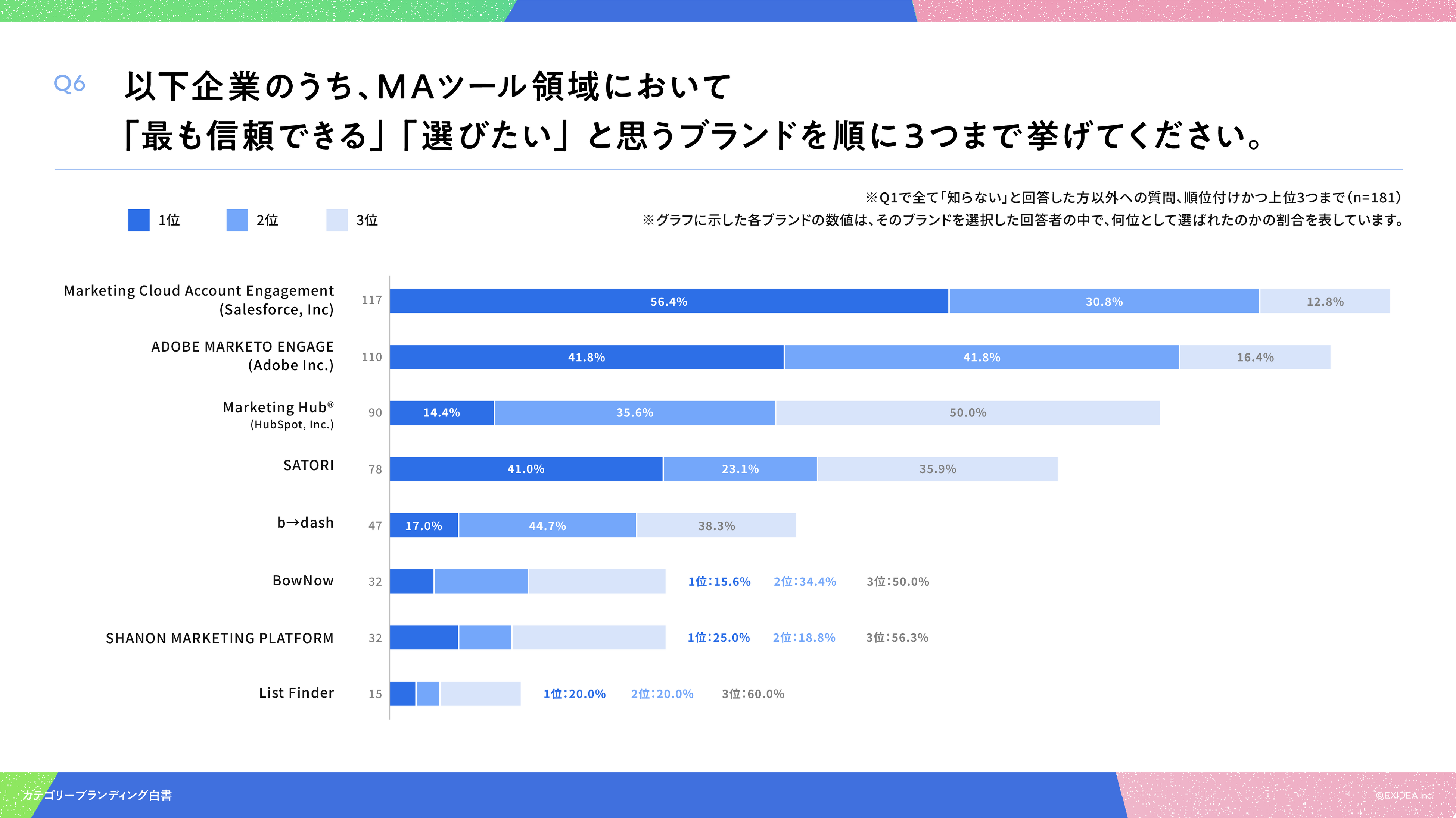 グラフに示した各ブランドの数値は、そのブランドを選択した回答者の中で、何位として選ばれたかの割合を表しています。例えば、Marketing Cloud Account Engagementの「1位:56.4%」という結果は、Marketing Cloud Account Engagementを選んだ回答者のうち56.4%が同ブランドを1位として挙げたことを意味します。