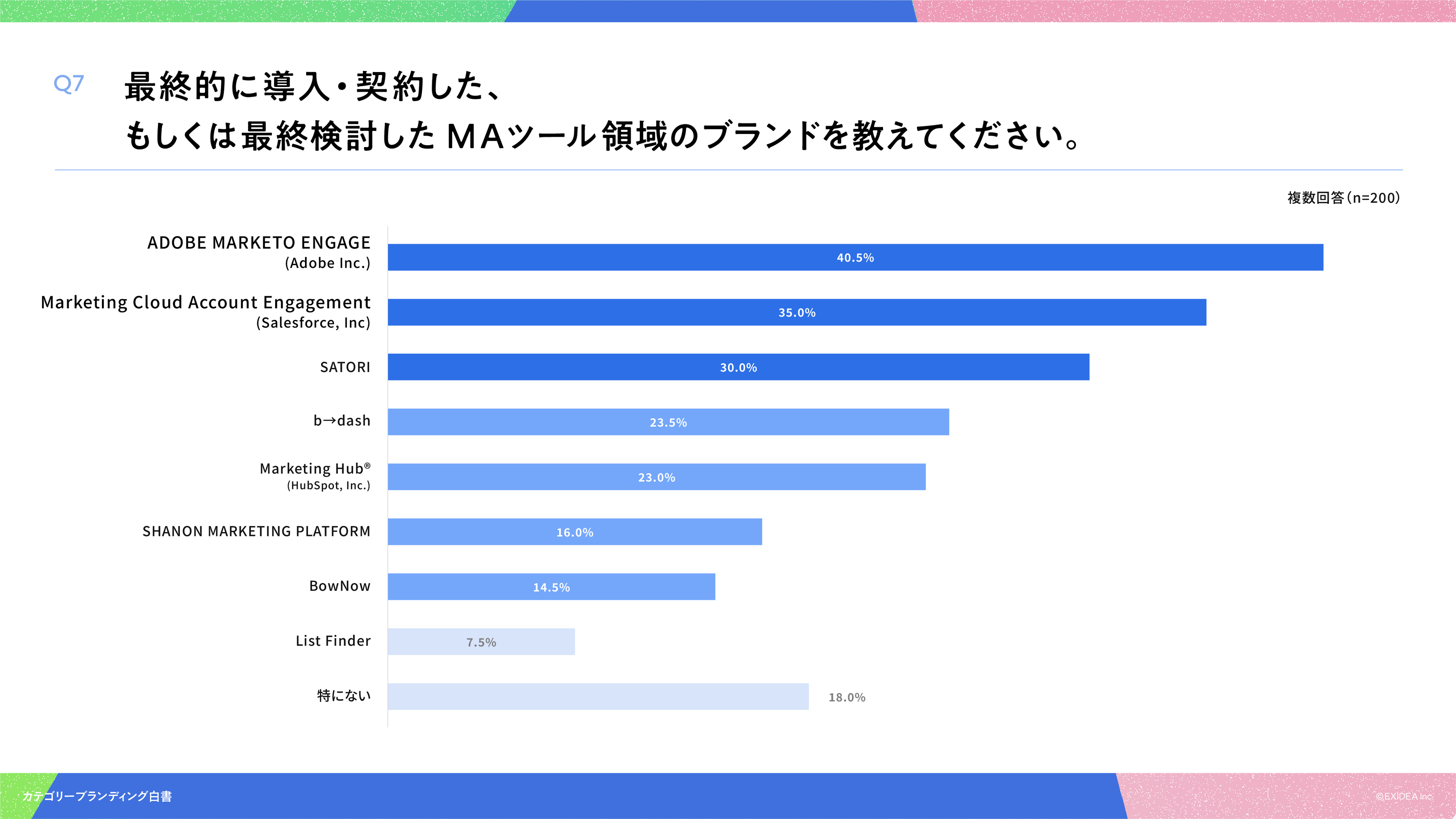 「Q7. 最終的に導入・契約した、もしくは最終検討したSEOツール領域のブランドを教えてください。(複数回答)」(n=200)と質問したところ、ADOBE MARKETO ENGAGEが40.5%、Marketing Cloud Account Engagement が35.0%、SATORI が30.0%という回答となりました。