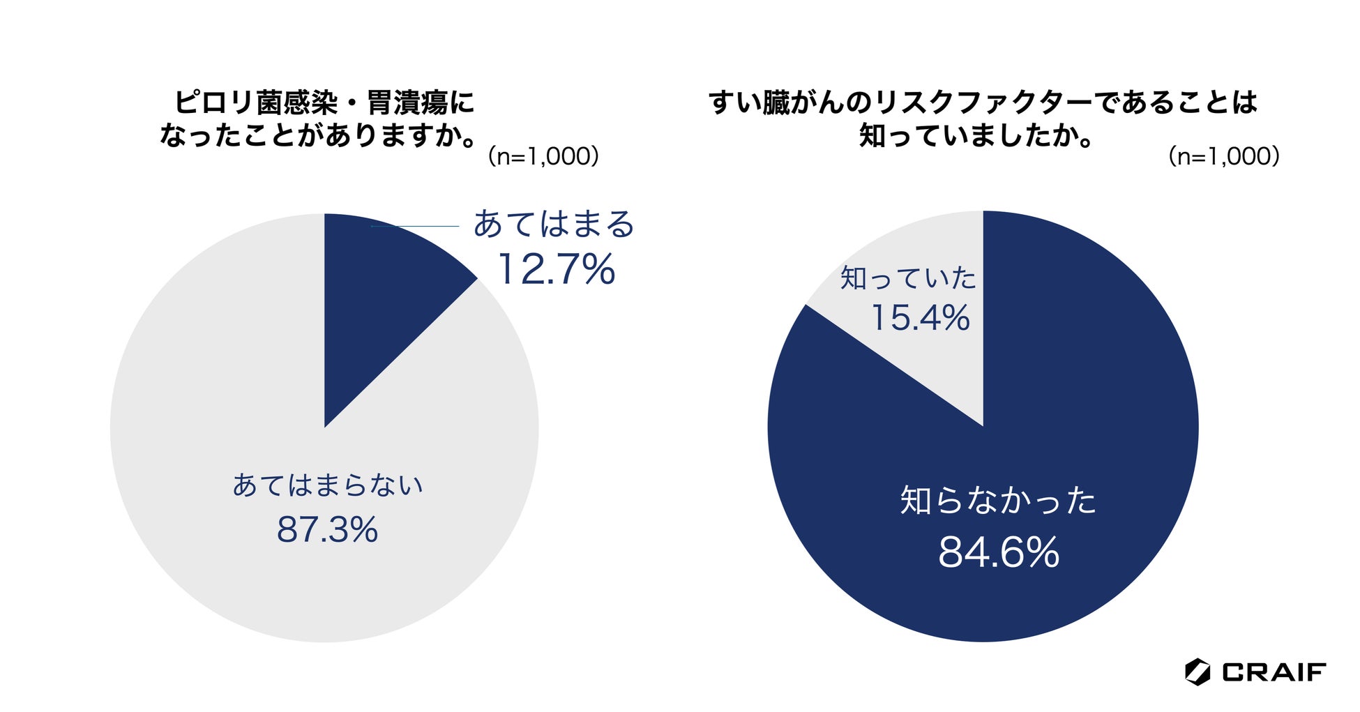 すい臓がんのリスクファクターの1つである「ピロリ菌感染や胃潰瘍になったことがある」に当てはまると回答した方は12.7%にのぼりました。しかしながら、「ピロリ菌感染や胃潰瘍になったことがある」がすい臓がんのリスクファクターであると知らなかった人は84.6%と、約8割が一部の感染症がすい臓がんリスクファクターである事実について知らないということがわかりました。(n=1,000)