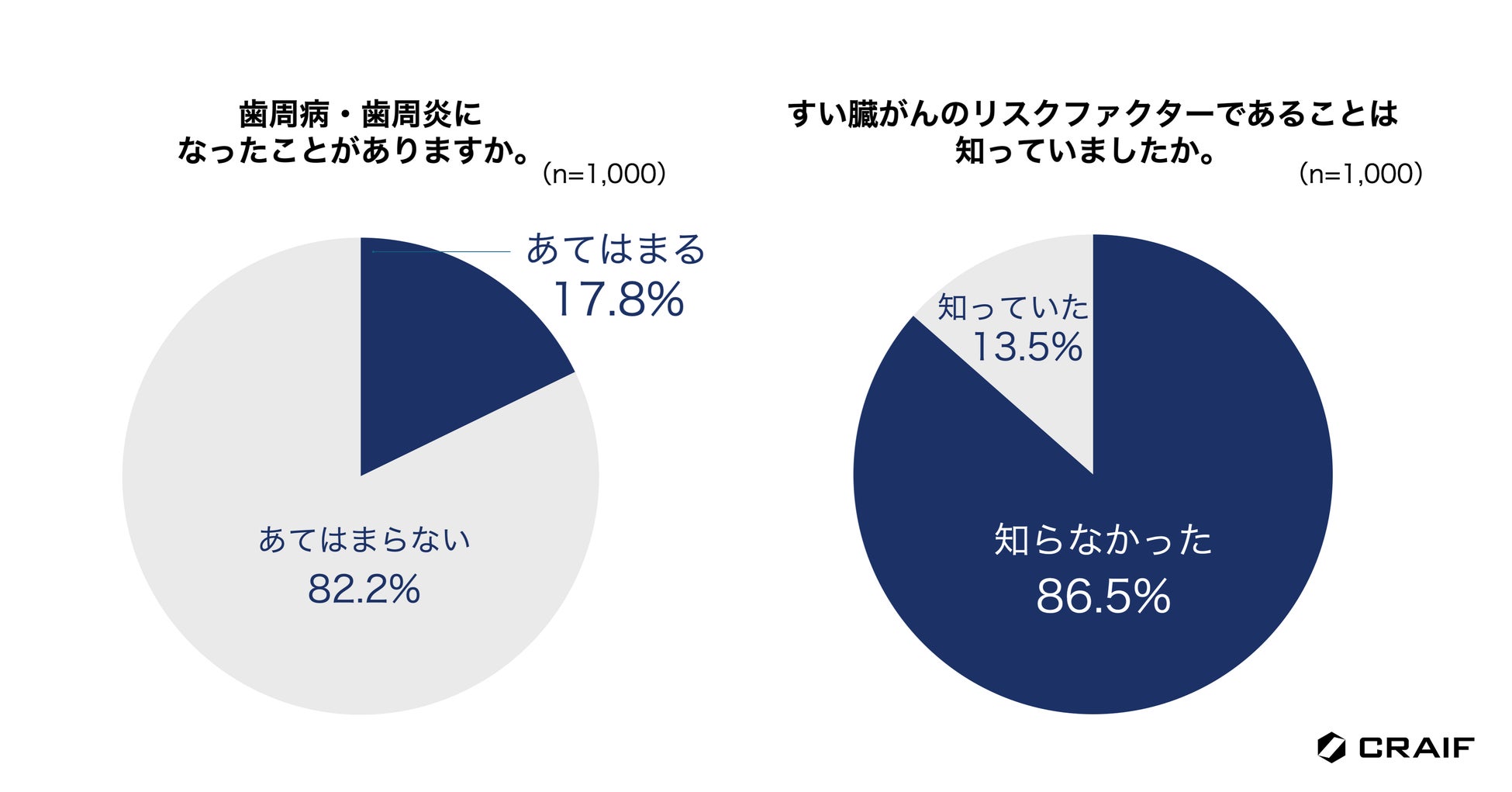 すい臓がんのリスクファクターの1つである「歯周病・歯周炎」に当てはまると回答した方は17.8%にのぼりました。しかしながら、「歯周病・歯周炎」がすい臓がんのリスクファクターであると知らなかった人は86.5%と、約8割が歯周病・歯周炎がすい臓がんリスクファクターである事実について知らないということがわかりました。(n=1,000)