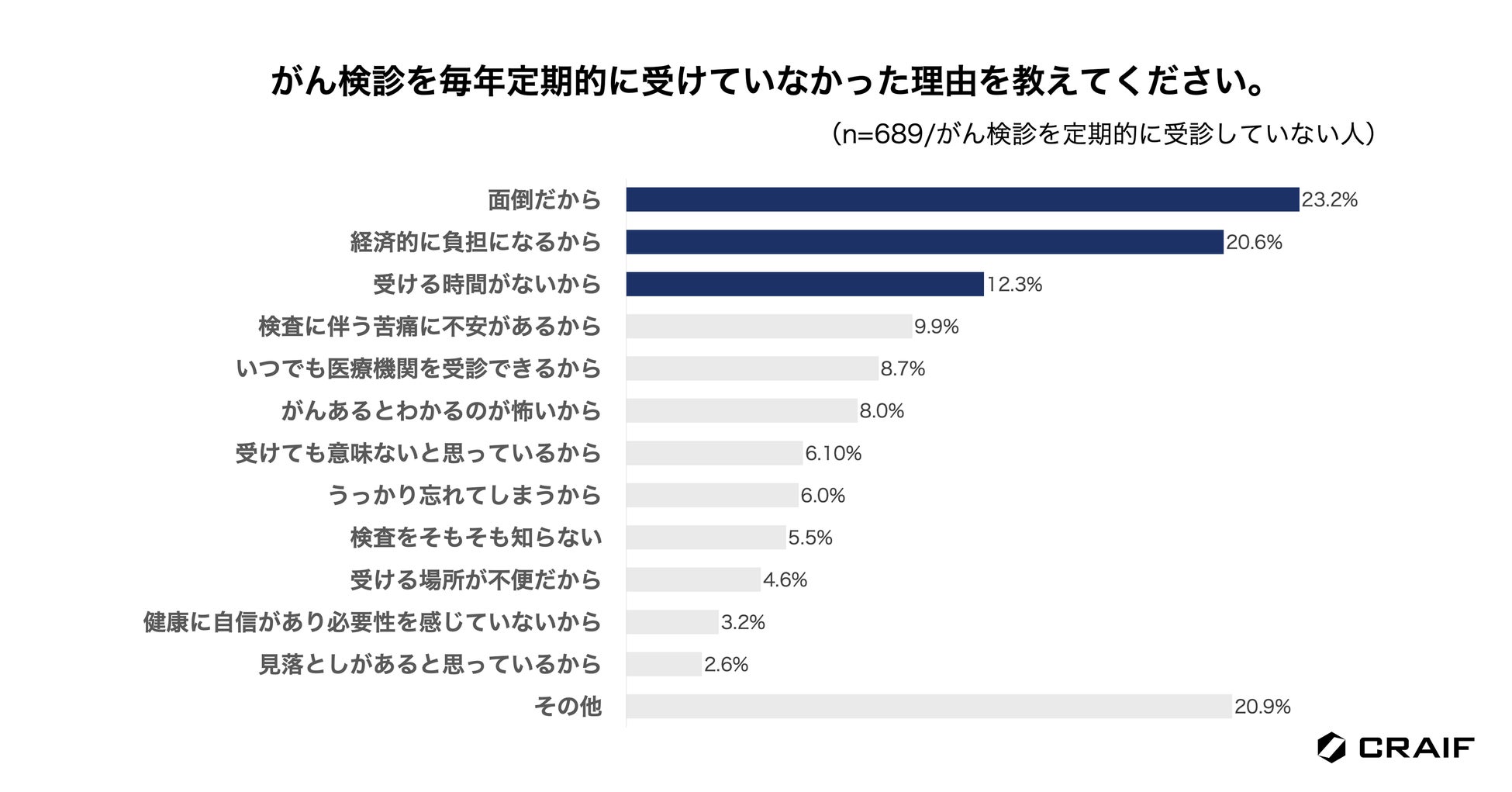 がん検診(市区町村の住民検診、職場での職域検診)を定期的に受けなかった理由を尋ねたところ、「面倒だから」が23.2%、「経済的に負担になるから」が20.6%、「受ける時間がないから」が12.3%、と続きました。(n=689/がん検診を定期的に受診していない人)