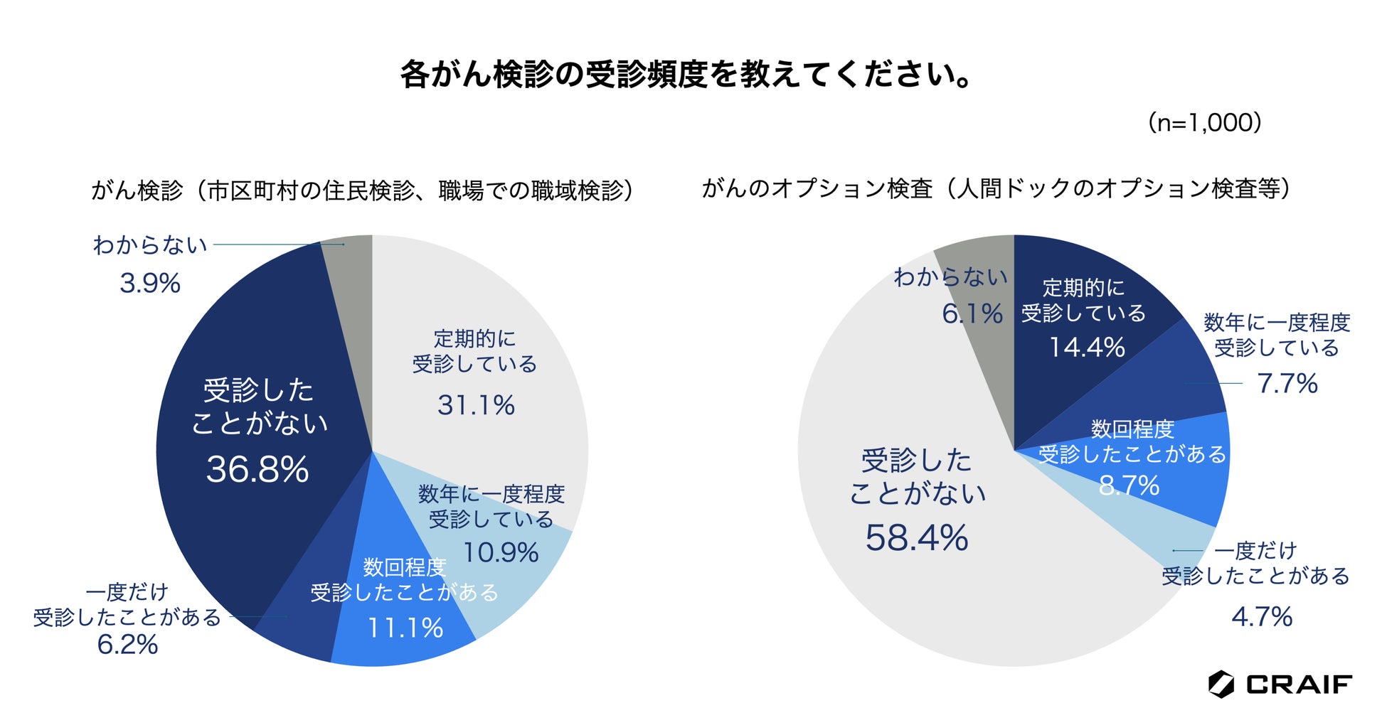 がん検診(市区町村の住民検診、職場での職域検診)の受診頻度を尋ねたところ、「受診したことがない」が36.8%いることがわかりました。また、「数年に一度程度」「数回程度」「一度だけ」と、がん検診が定期的な習慣となっていない層も含めると約7割が定期的にがん検診を受けていなかったことがわかりました。また、がんのオプション検査(人間ドックのオプション検査等)を「定期的に受診している」が全体の14.4%と、がんの早期発見に主体的に取り組んでいる人はごくわずかであることがわかりました。(n=1,000)