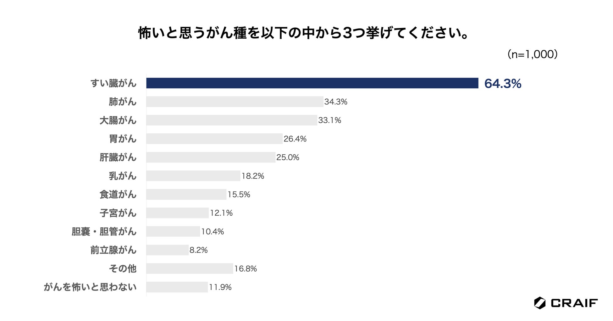 特に怖いと思うがん種を尋ねたところ、「すい臓がん」が64.3%と最も多く、「肺がん」が34.3%、「大腸がん」が33.1%と続き、多くの方が「すい臓がん」を特に怖いと感じていることがわかりました。(n=1,000)