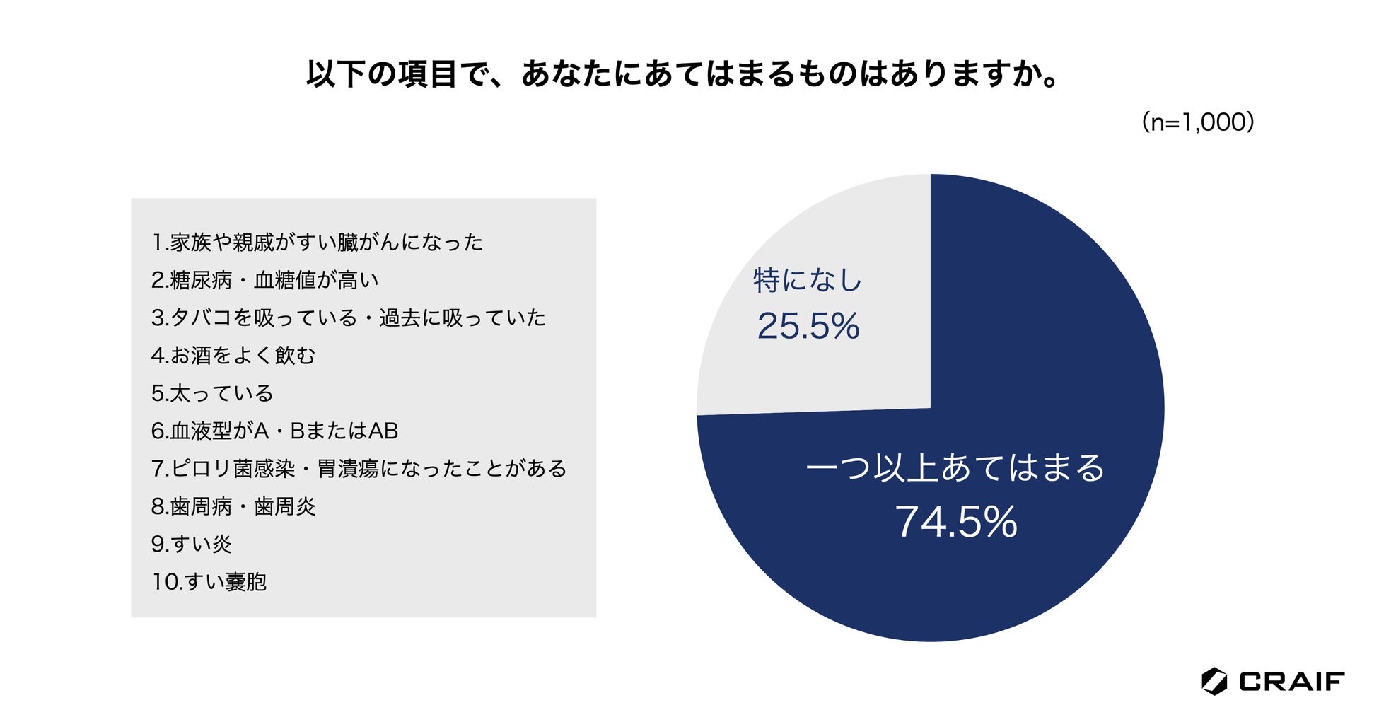 すい臓がんのリスクファクターについてあてはまるかどうか尋ねたところ、7割以上の人が、何らかの因子を有していると回答しました。(n=1,000)