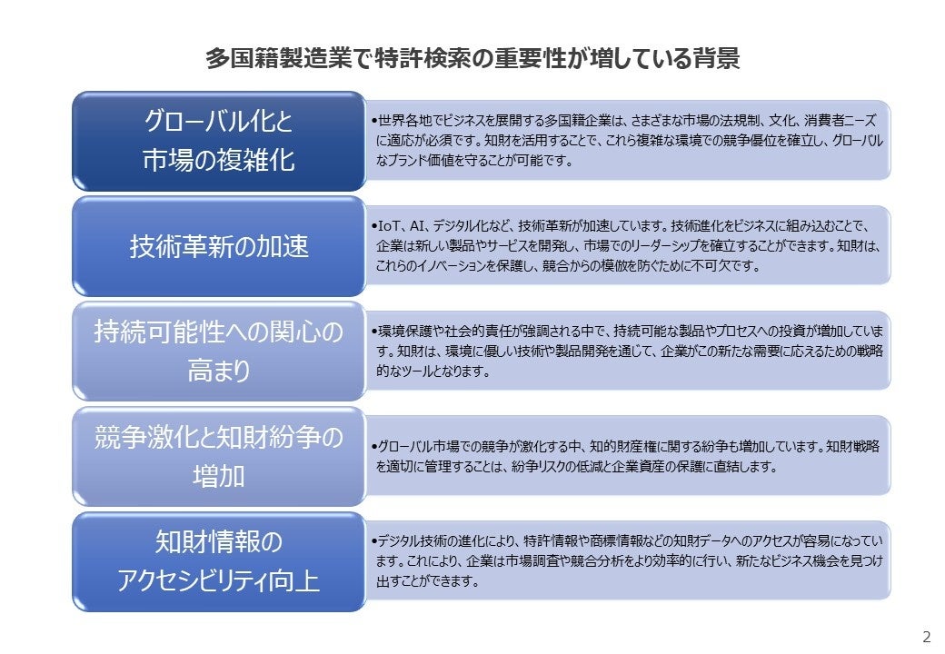 1. グローバル化と市場の複雑化: 世界各地でビジネスを展開する多国籍企業は、さまざまな市場の法規制、文化、消費者ニーズに適応が必須です。知財を活用することで、これら複雑な環境での競争優位を確立し、グローバルなブランド価値を守ることが可能です。