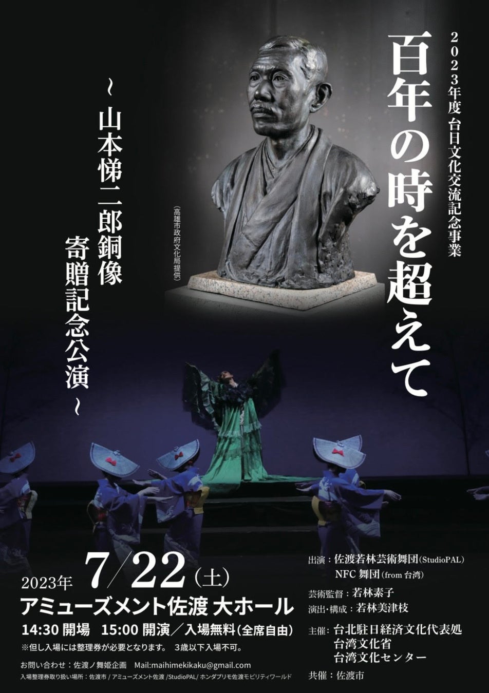 佐渡市民へ感謝の意を込めて、この度台北駐日経済文化代表処・台湾文化センター及び台湾文化省主催、佐渡市共催の下、山本悌二郎銅像寄贈記念公演が7月22日佐渡市アミューズメント佐渡大ホールにて開催される。
