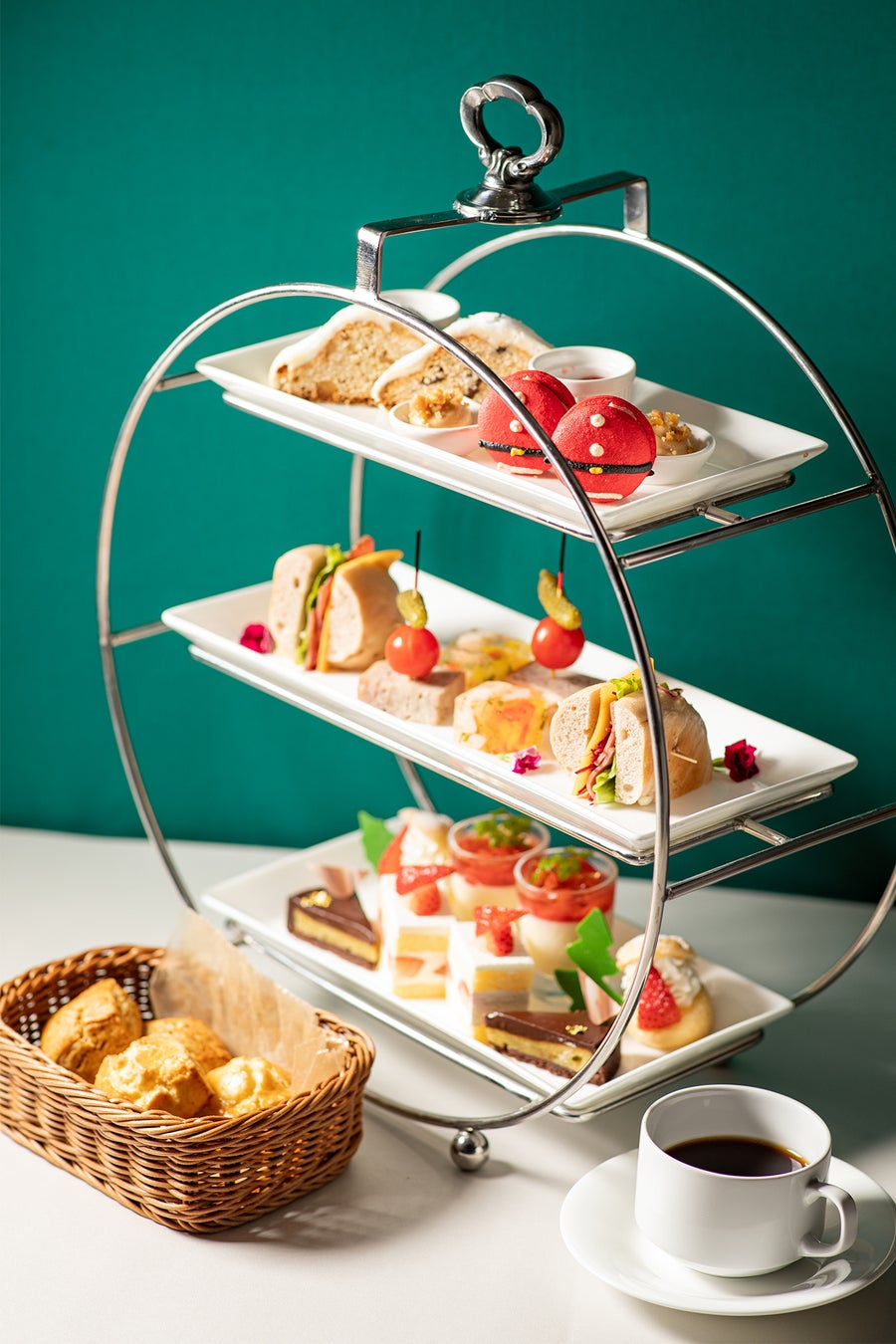 季節ごとにテーマを変え、シェフパティシエ 貝塚文浩(かいづか ふみひろ)が手掛ける「ラウンジ サウスコート」人気のアフタヌーンティー。クリスマス気分が高まり始め、少しずつ街中にもイルミネーションの準備が進む11月からは、赤・緑・白などのクリスマスカラーを取り入れたクリスマスバージョンでご用意します。