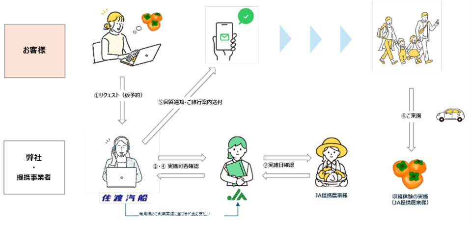 佐渡島で水稲に次ぐ基幹品目である「おけさ柿」は、高齢化による生産者の減少により栽培面積が減少しています。また、人手不足のため観光農園化もしづらく、農業の高付加価値化と地域ブランドの発信に課題があります。そこで、佐渡汽船はJA佐渡と連携し、JA加盟農家での収穫体験の仕組みを整備。旅行者も、農業従事者との交流の中で、農産物の魅力を認知・理解することで、農作物の生産・消費維持を目指します。