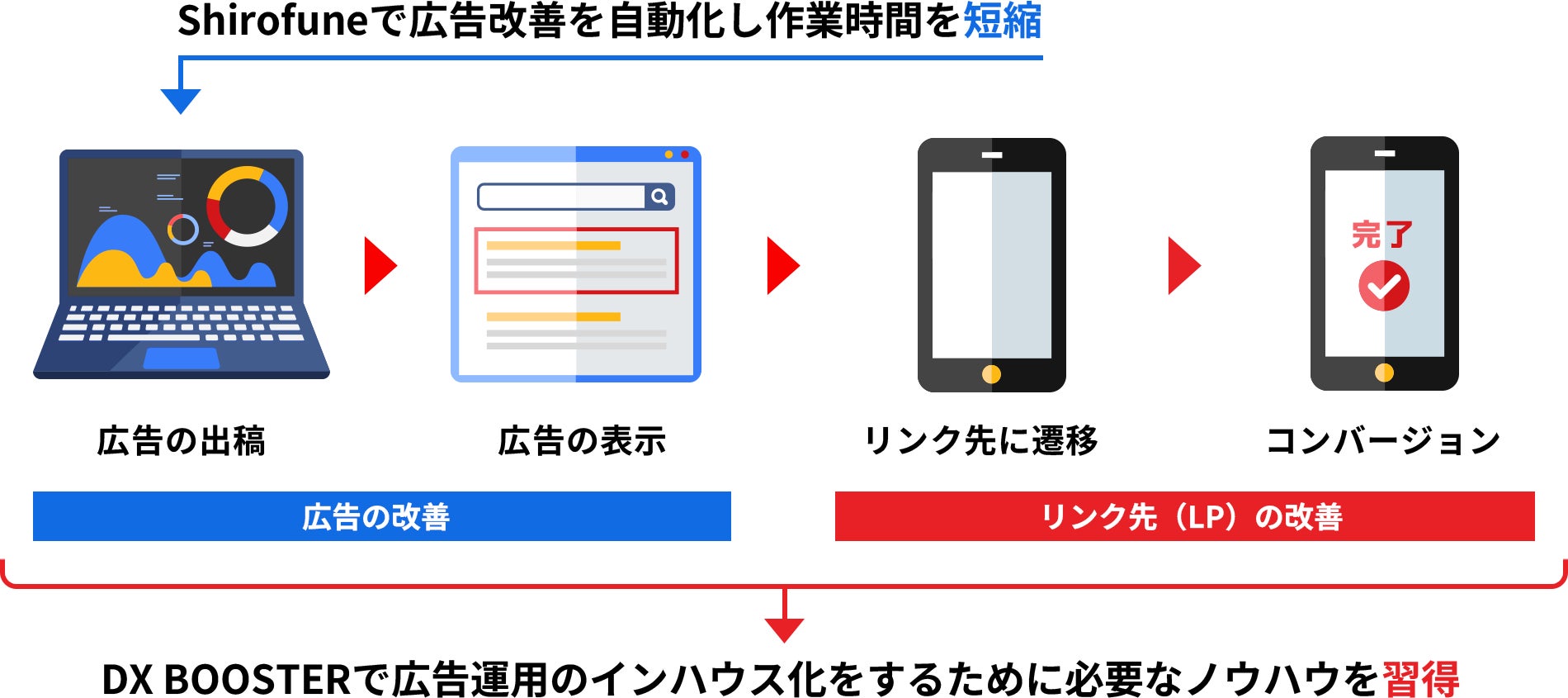 本プログラムでは、当社が提供するマーケティング研修サービス「DX BOOSTER(読み方:ディーエックスブースター)」で広告運用の基礎から応用までを体系的に学びながら、広告運用自動化ツール「Shirofune」を活用することで、これから広告インハウス化を始める企業から、広告インハウス運用中だがもっと効率よく成果を出したい企業まで、広告運用のインハウス化による成果の最大化を支援します。