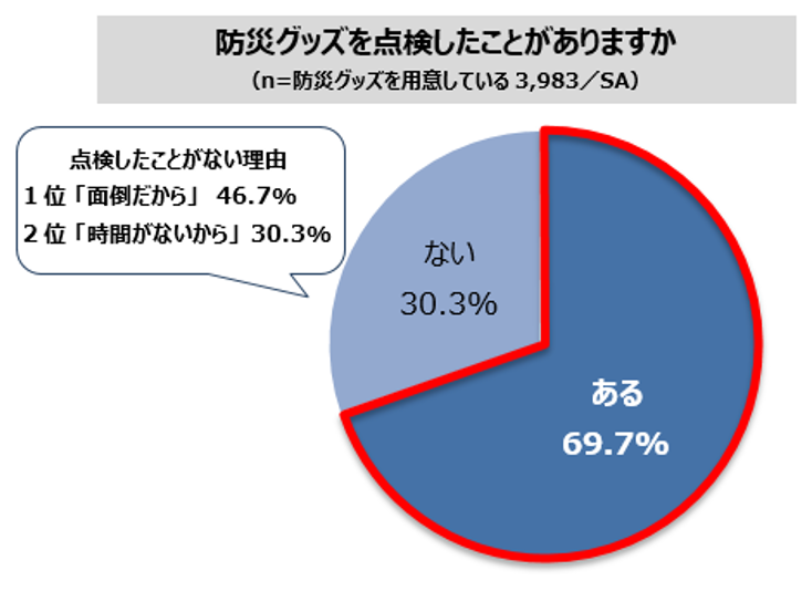 防災グッズの点検をしたことがある人は69.7%。一方点検が面倒・大変だと思う人の割合は約7割も!特に点検が大変な防災グッズ1位は「非常食・保存食」で81.6%、2位は「飲料水」で41%