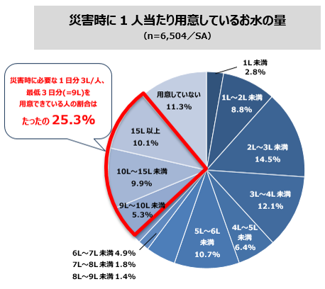 防災備蓄として飲料水(お水)を用意している人が80.9%いる一方、災害時に必要な1日3L/人 、最低3日分(=9L)の飲料水(お水)を用意できている人はたったの25.3%。また、災害時等に備えてお水を用意していない理由1位は「備蓄しておく場所がない」で45.2%、2位は「何を用意すればいいのかわからない」で31.4%。