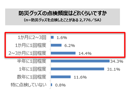 41.0%。また防災グッズの点検は、年に4回おこなうことが推奨されていますが、年に4回程度点検ができている人の割合は22.2%という結果に。