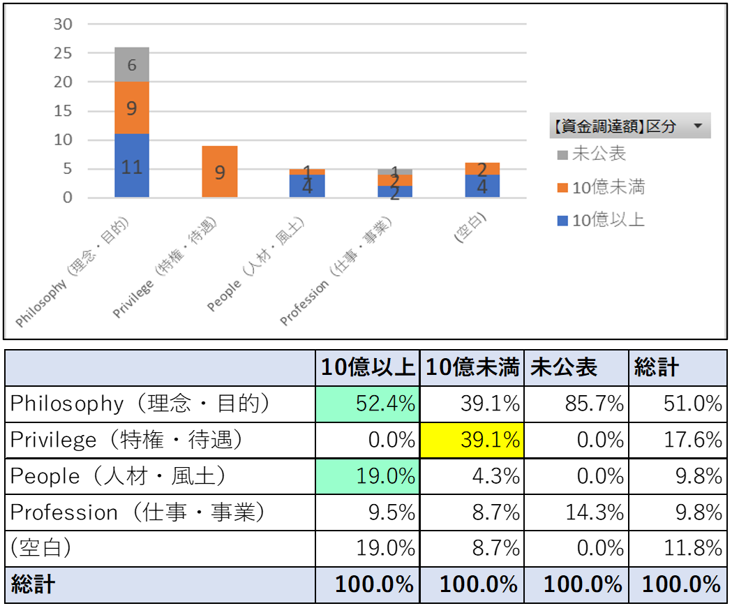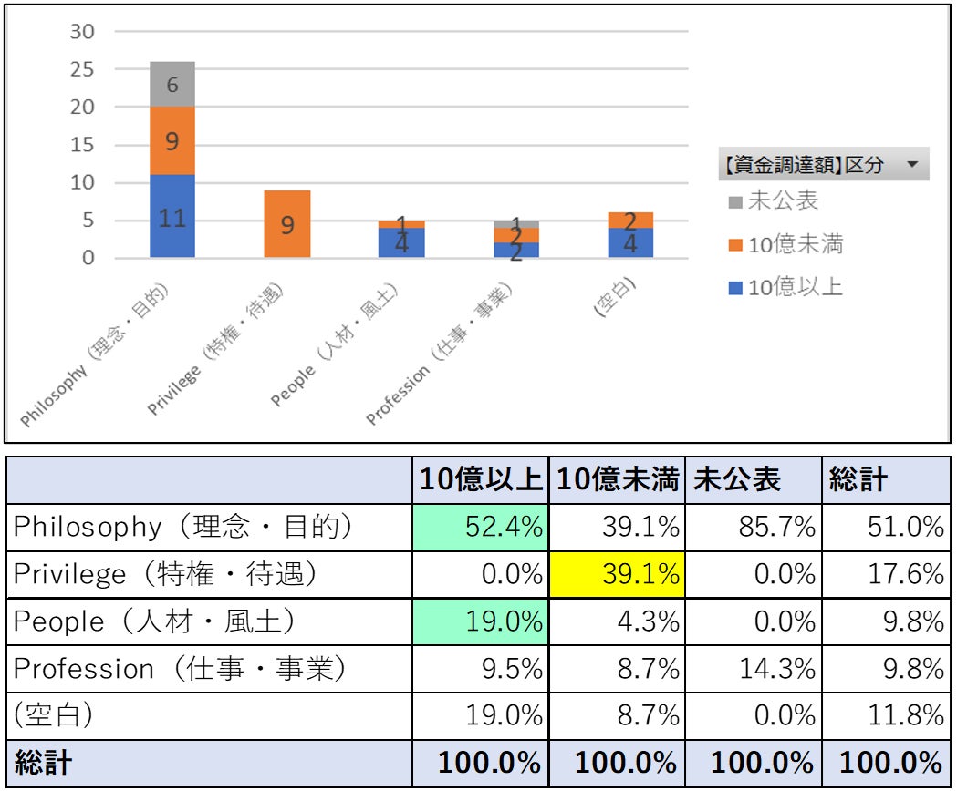 資金調達別では10億以上の企業はPhilosophy(経営理念/スローガン)、People(求める人物像/従業員写真)を