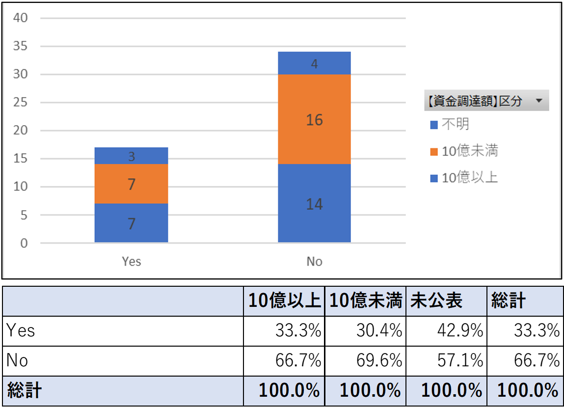 資金調達を行った企業での調査調達金額と採用サイトの運用状況の相関関係を調査した。
