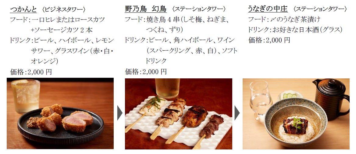 お酒もたくさん飲みたいけど、食事もしっかり楽しみたい!という方には、ボリュームある食事が付いた和食のセットをご紹介します。フレンチの技術を用いた和食料理店「つかんと」は、ヒレカツまたはロースカツにソーセージカツ2本が付いたセット、全国地鶏・銘柄鶏コンテスト最優秀賞の鶏肉を使用する「野乃鳥 幻鳥」では、焼き鳥4串のセットを提供。最後には、「うなぎの中庄」で〆のうなぎ茶漬けを堪能して贅沢に締めくくりください。なお、3店舗全て、豊富なドリンクの中からお好みのものをお選びいただけます。