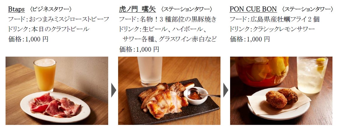 仕事帰りに気の置けない仲間と1,000円で気軽に楽しめる飲み歩きセットをご紹介。1日の疲れを流す最初の一杯は「Btaps」の日替わりクラフトビール。「虎ノ門 嚆矢」の名物!3種部位の黒豚焼きをお好みのお酒と共に食した後、立ち飲み「PON CUE BON」の広島県産牡蠣フライと広島県産レモンを使ったレモンサワーで、大人な〆の一杯をお楽しみください。