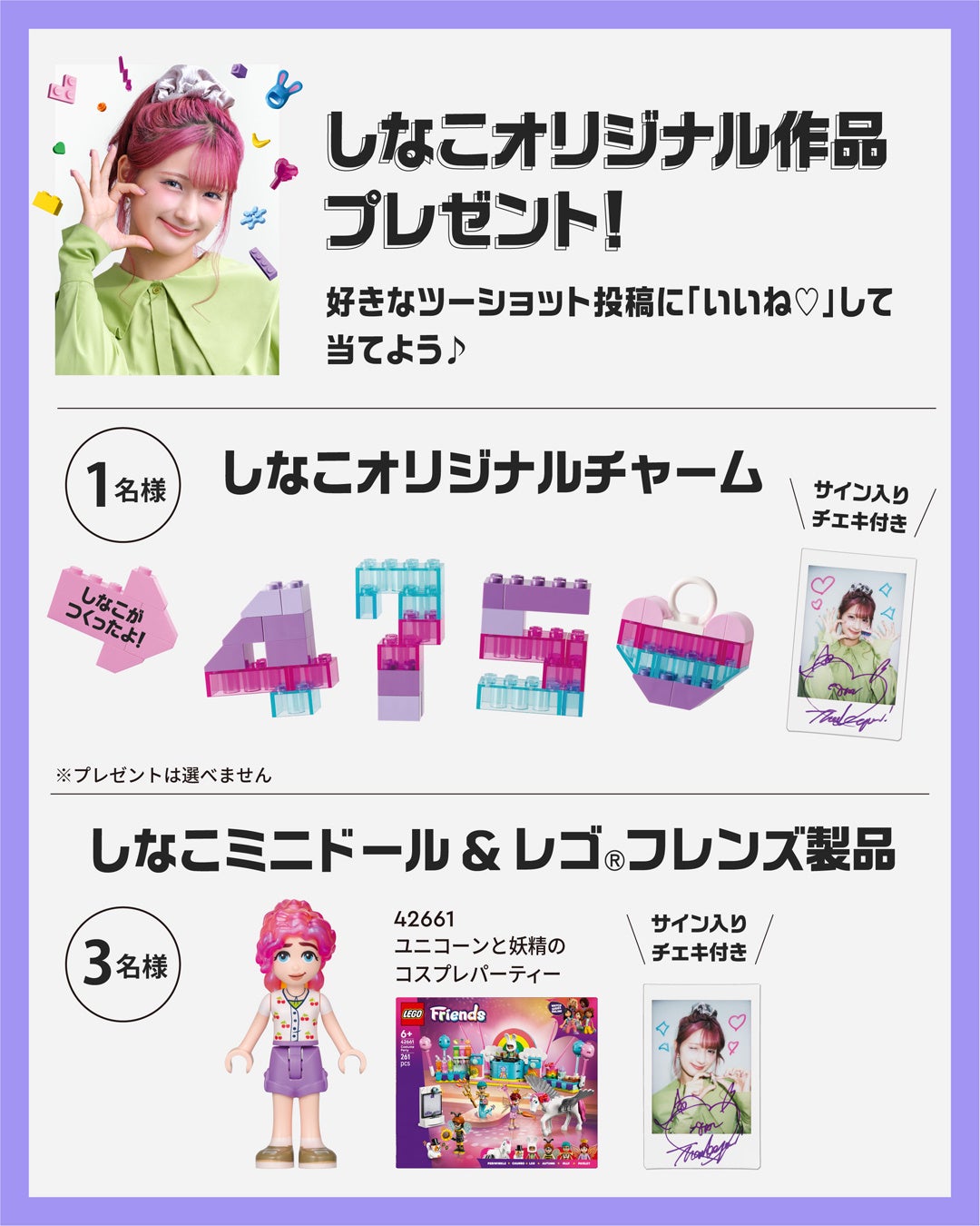 レゴジャパン公式Instagramアカウントをフォローして、アカウントに投稿されるミニドール ツーショット投稿のうち、どちらか好きな方に「いいね♡」で投票したお客さまの中から合計4名様に、レゴ®ブロックで作られたしなこさんオリジナルチャームや店頭で展開される「しなこミニドール」、しなこさんの直筆サイン入りチェキなどが当たります。前述の店頭で撮影した画像を「#ぜんぶかなえよう」「#レゴ」とともに投稿すると、プレゼントの当選率がアップします。