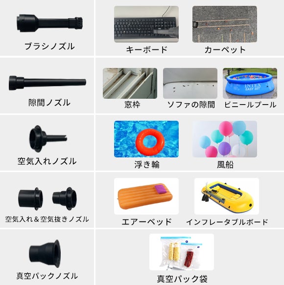 5. 7つのノズルが付属、隙間やキーボードなどの掃除、エアーベッドなどの空気入れ&空気抜きが簡単!