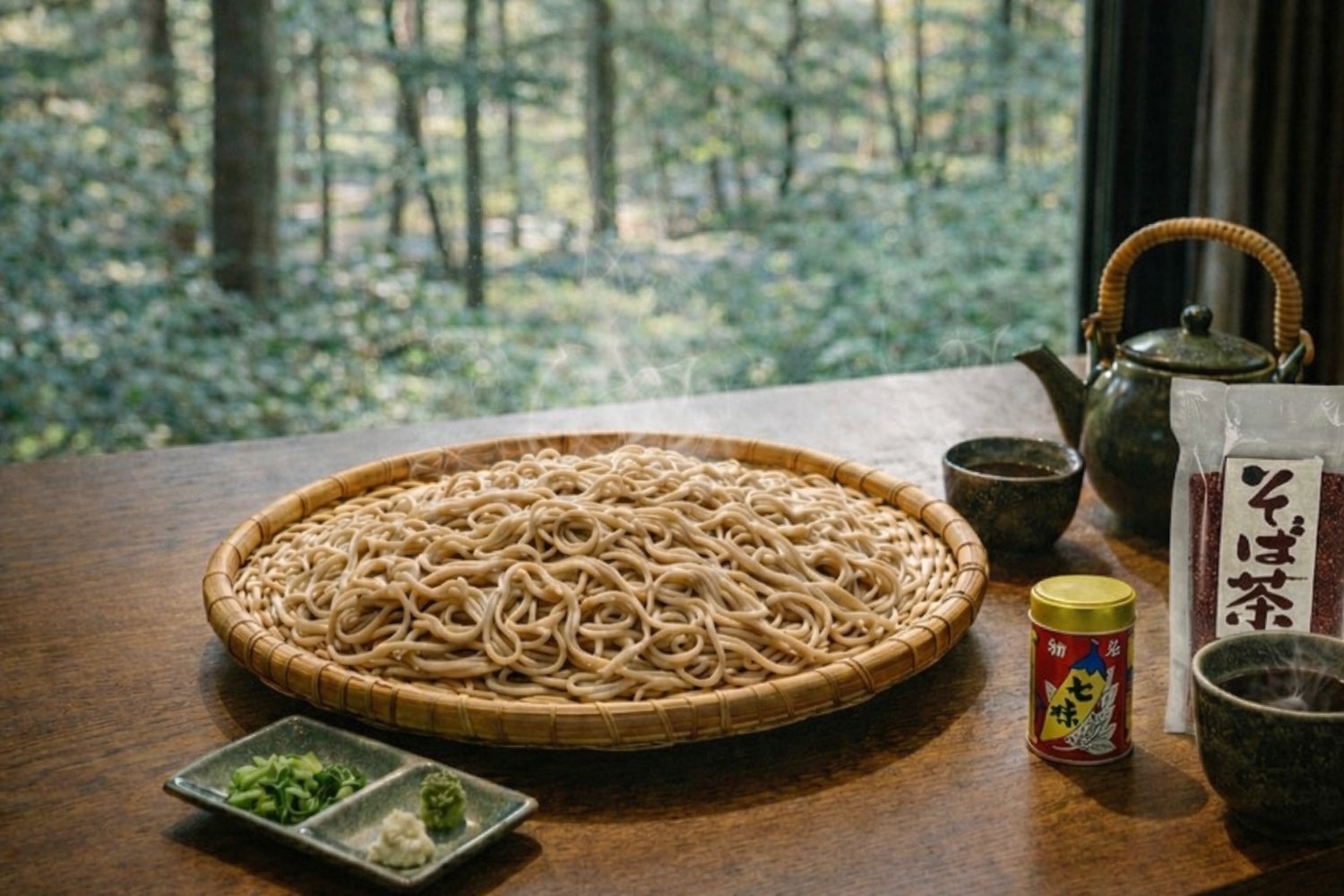 また、お土産として信州の老舗七味店「八幡屋磯五郎」の七味とそば茶をご用意。
