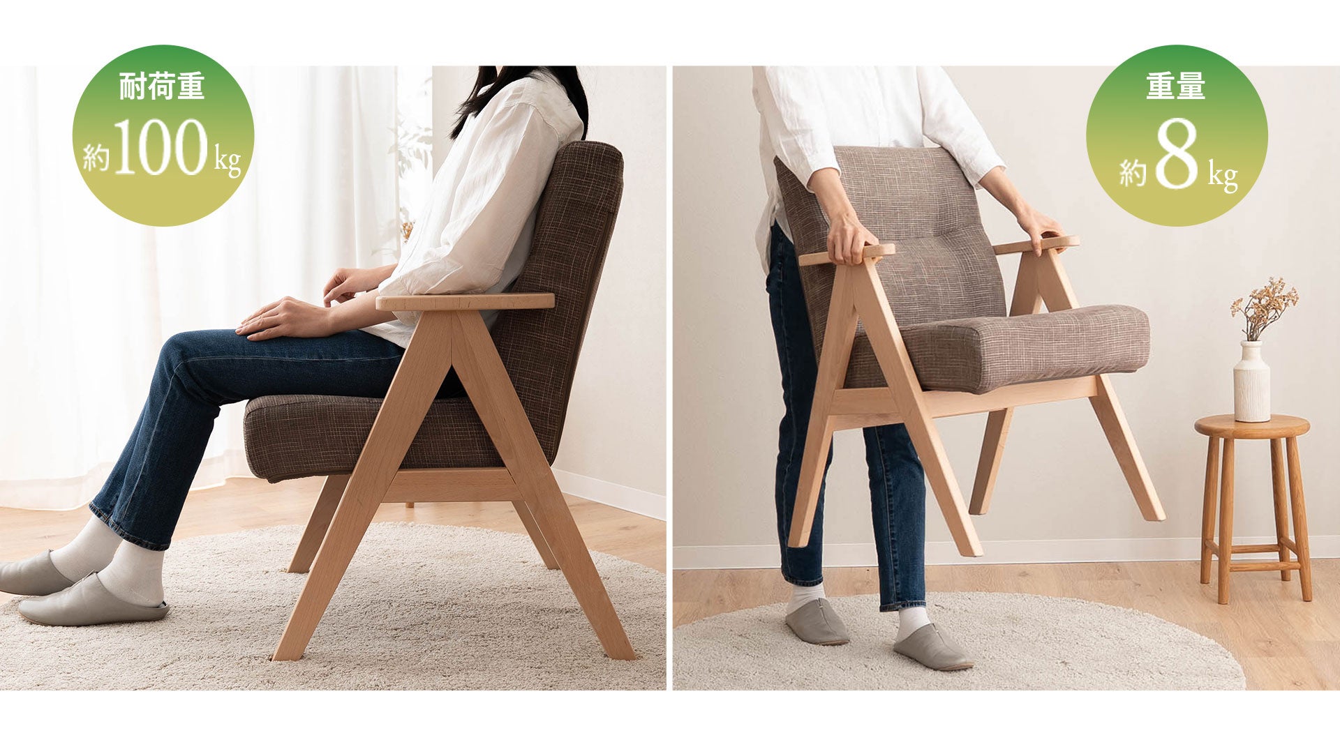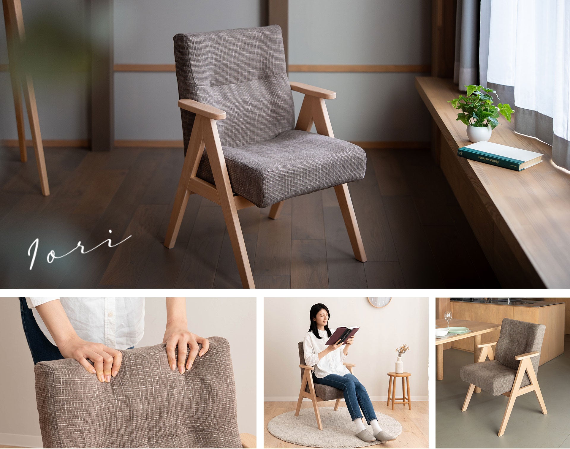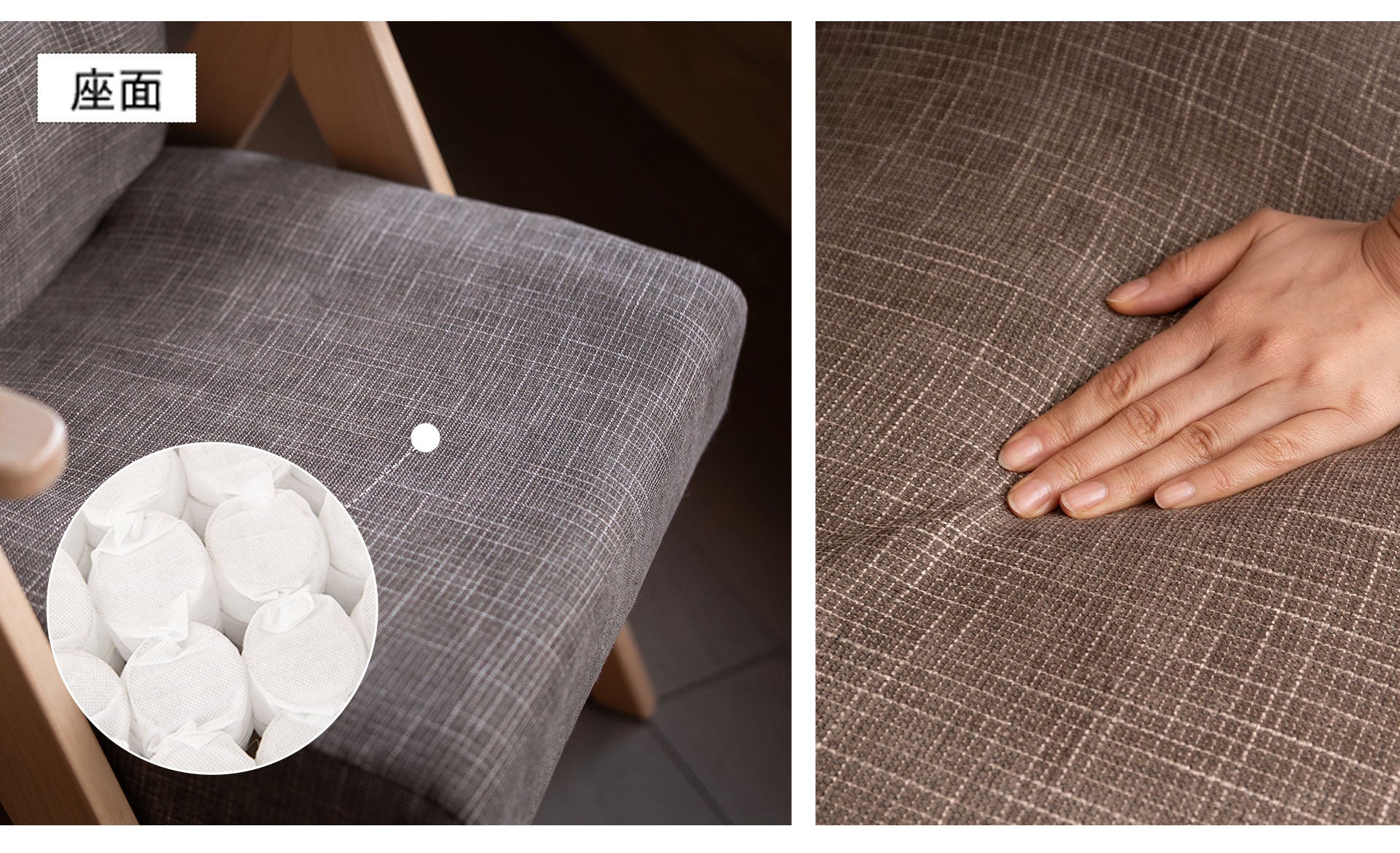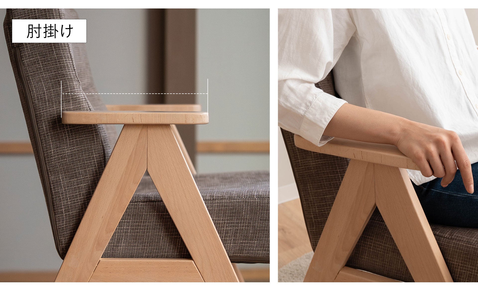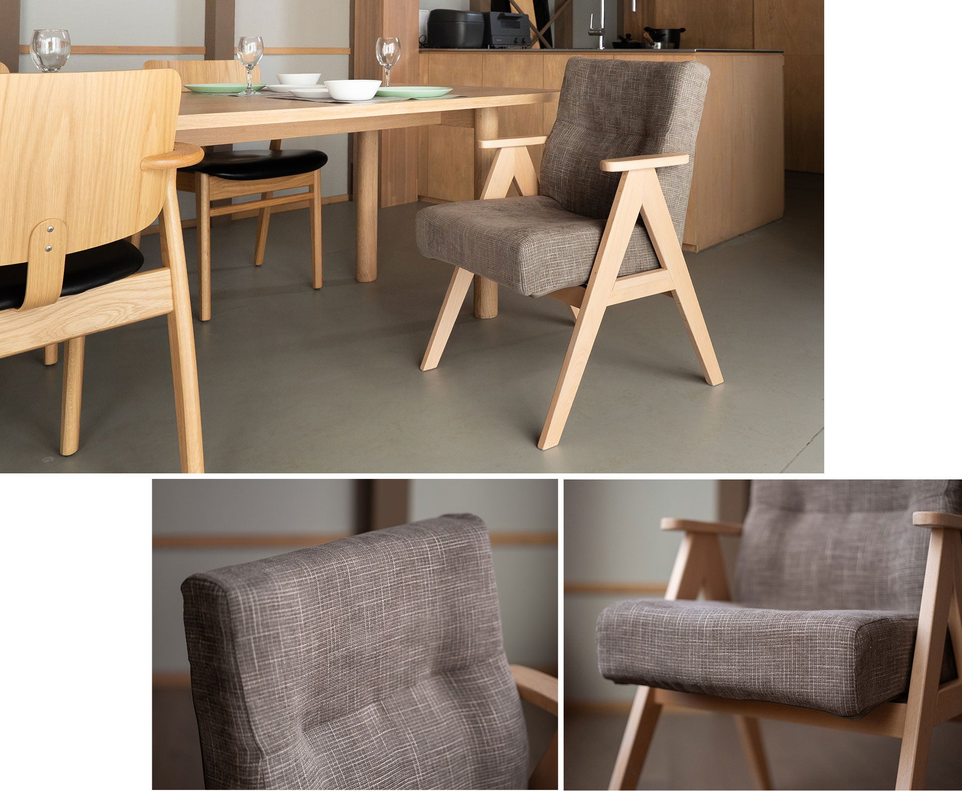 脚・肘部にはビーチ無垢材を使用したナチュラルな質感。シートには落ちついた風合いの生地を組み合わせ。主張しすぎないデザインで、和洋問わずインテリアに自然に溶け込みます。ダイニング・リビング・書斎・寝室・オフィスなど、あらゆる場面で活躍します。