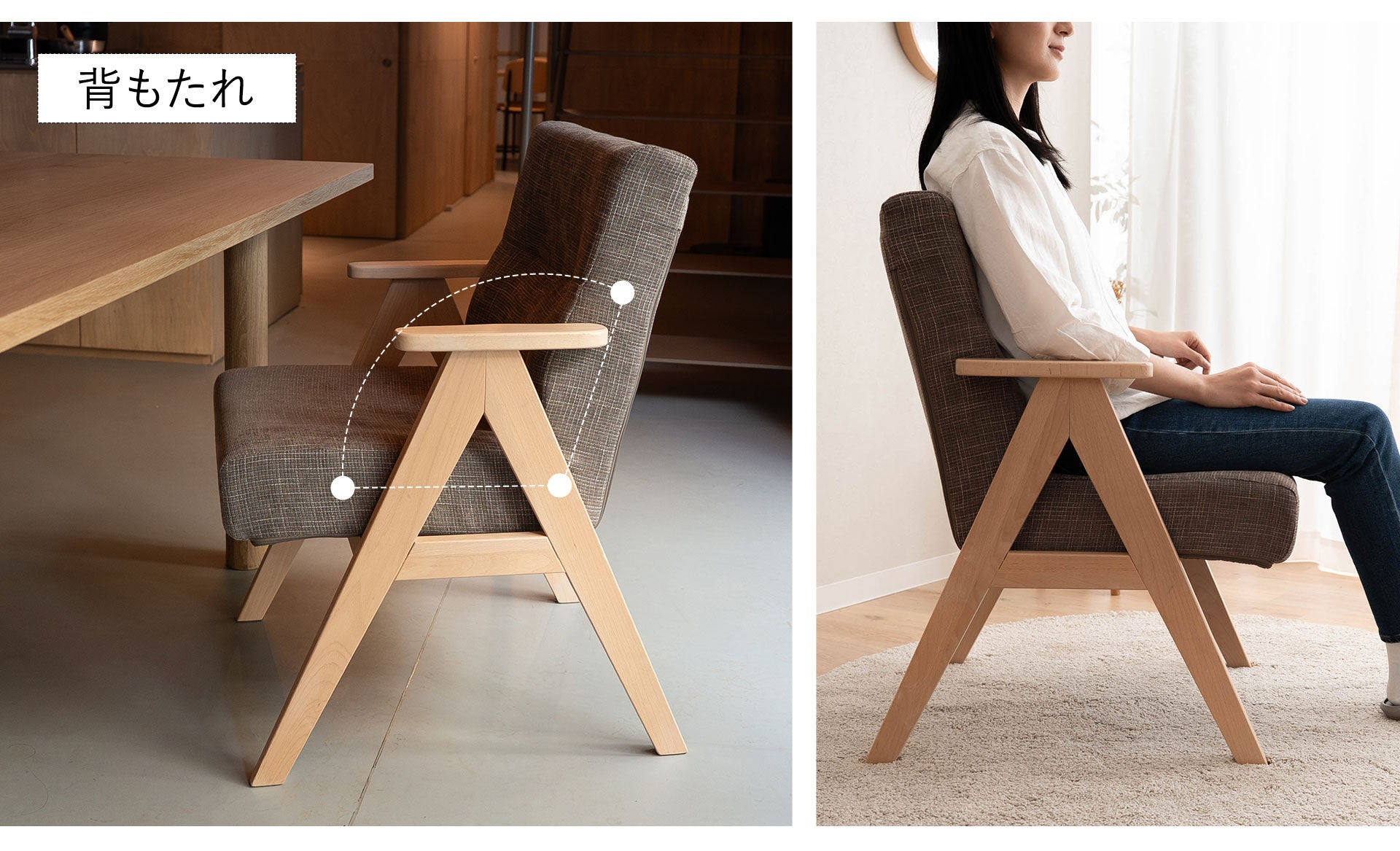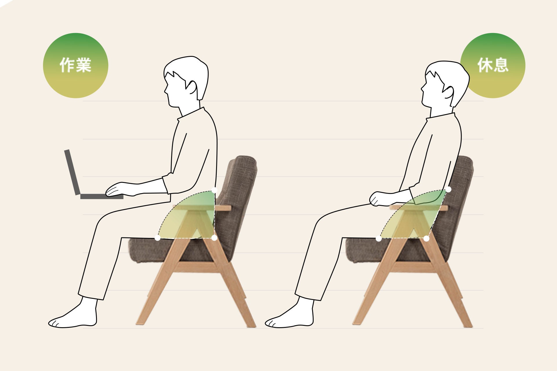 背中を丸めない適度な支えで、座ったときに姿勢が崩れにくく、自然な姿勢を保てる角度に設計されています。背中から腰にかけてのラインを安定させ、身体をあずけても無理のない座り心地を実現。くつろぎと作業、どちらの姿勢にも移りやすい背もたれで、くつろぎの合間に家事をされるライフスタイルにも最適です。
