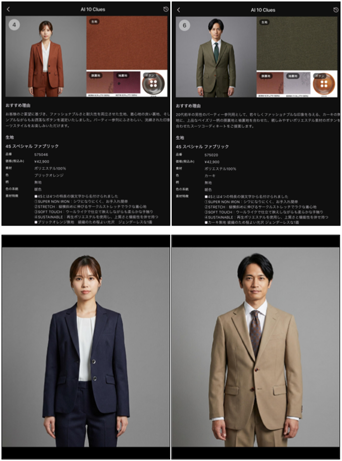 「生成AI」がオーダースーツの生地および付属(ボタン・胴裏地・袖裏地)までを一貫してレコメンドする仕組みは業界初(※当社調べ)となり、今までにないオーダースーツ購入の「気軽さ」と「納得感」をご体験いただけます。