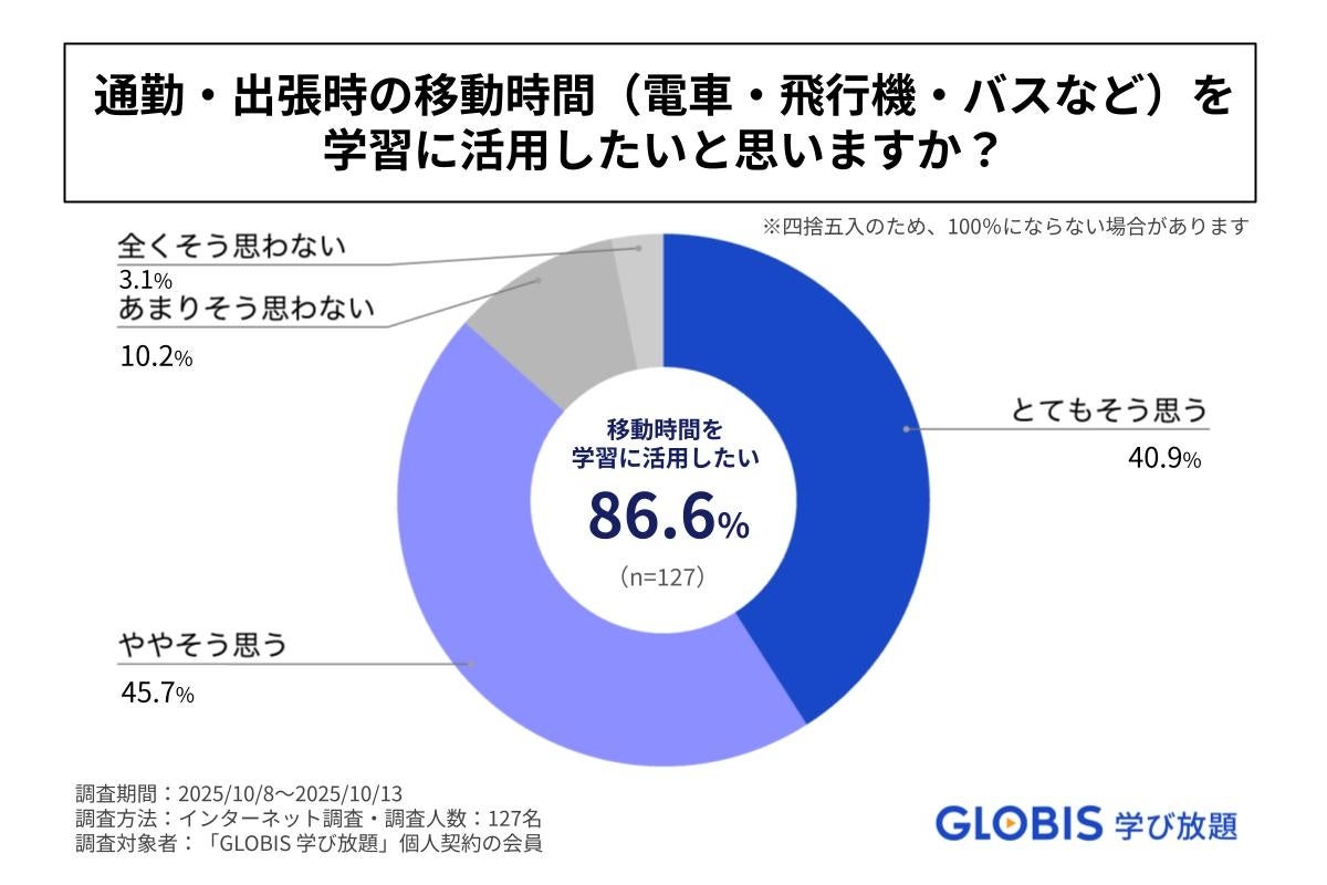 急速な技術革新やグローバル競争の激化により、ビジネスパーソンは、常に新たな知識とスキルが求められています。「GLOBIS 学び放題」が実施した調査では、8割以上が「移動時間を学習に活用したい」と回答。学習意欲の高さと、時間の有効活用に対するニーズの高さが明らかとなりました(図1)。また、7割以上が、「移動時間を有効活用し、学習や自己研鑽を実践したことがある」と回答しており、すでに多くの人が移動時間という「隙間時間」を活用し成長の機会としていることがわかります(図2)。