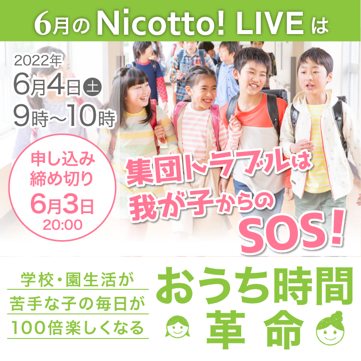 『集団トラブルは我が子からのSOS! 学校・園生活が苦手な子の毎日が100倍楽しくなるおうち時間革命』を学ぶNicotto!塾オンラインライブ開催決定