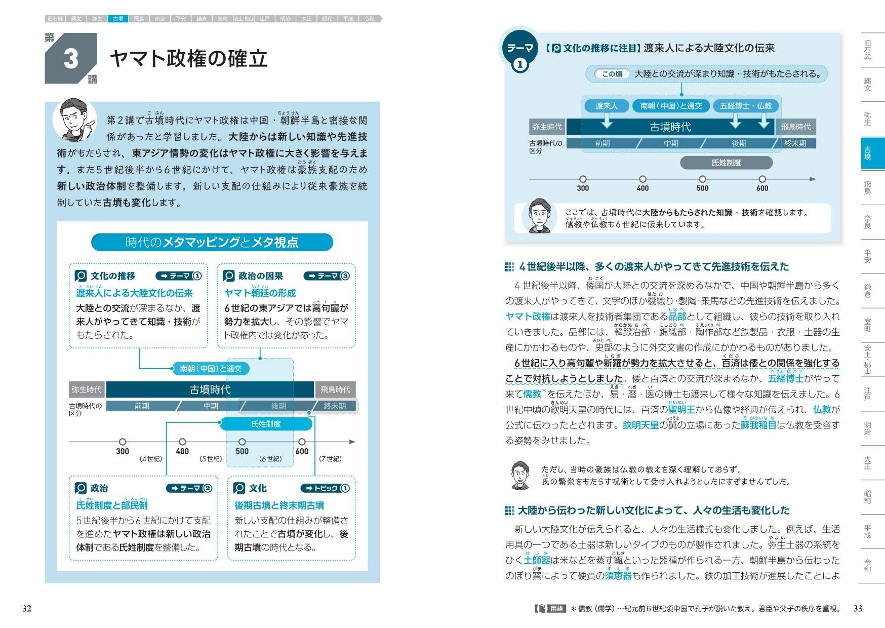 各講義の最初に掲載されている「メタ視点とメタマッピング」によって、どの時代の、どの内容を学習しているのか、どの点に注目すれば良いのかを確認することができます。学習の全体像が最初に理解できるので、時代の流れ、変化、因果関係、歴史事象の関係性を、前後の時代も含めた広い視点・視野で学習できます。