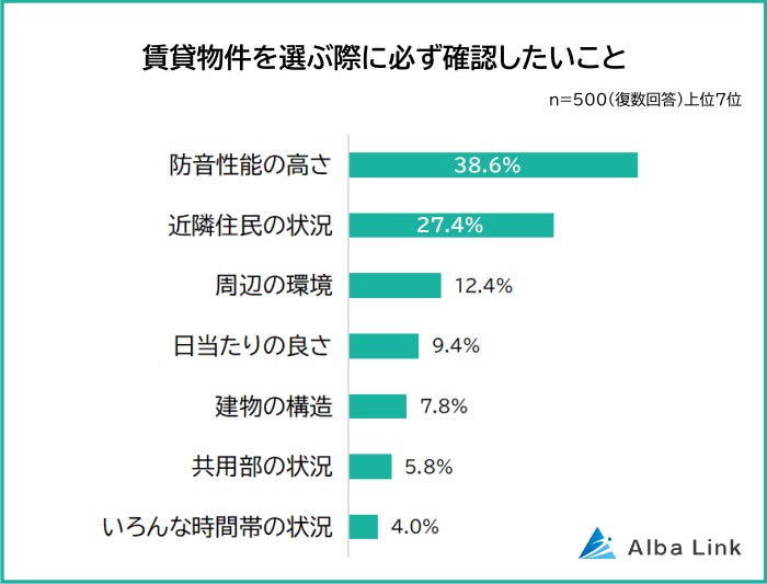 賃貸物件で失敗した経験から「賃貸物件を選ぶ際に必ず確認したいこと」を聞きました。その結果、もっとも多かった回答は「防音性能の高さ(38.6%)」でした。次ぐ2位は「近隣住民の状況(27.4%)」となっています。