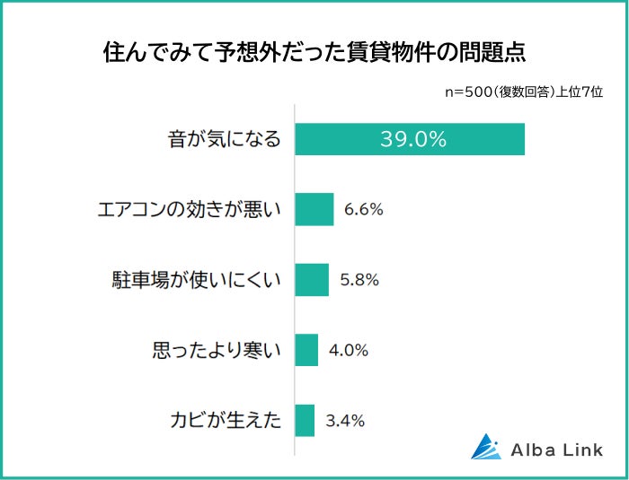 そこで「住んでみて予想外だった賃貸物件の問題点」を聞いたところ、圧倒的1位は「音が気になる(39.0%)」でした。やはり物件選びでは音がポイントだとわかります。以下、2位「エアコンの効きが悪い(6.6%)」、3位「駐車場が使いにくい(5.8%)」、4位「思ったより寒い(4.0%)」、5位「カビが生えた(3.4%)」の結果です。