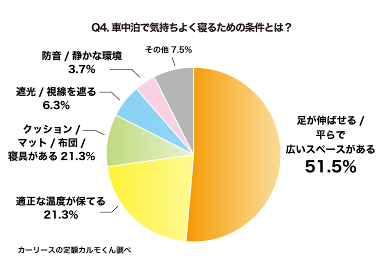 ほかにも遮光や防音など、車中泊であっても通常の就寝時と同じような「寝やすい環境」であることが気持ちよさを左右しているようです。