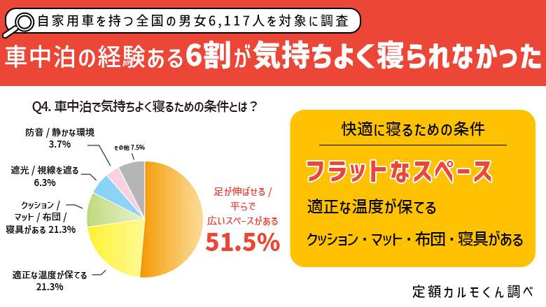 - 車内で快適に寝るためには「足が伸ばせるフラットなスペース」が重要